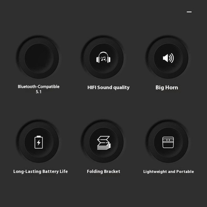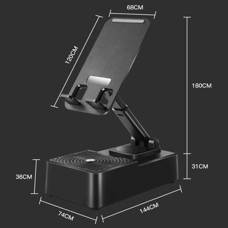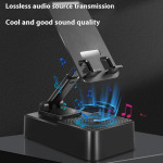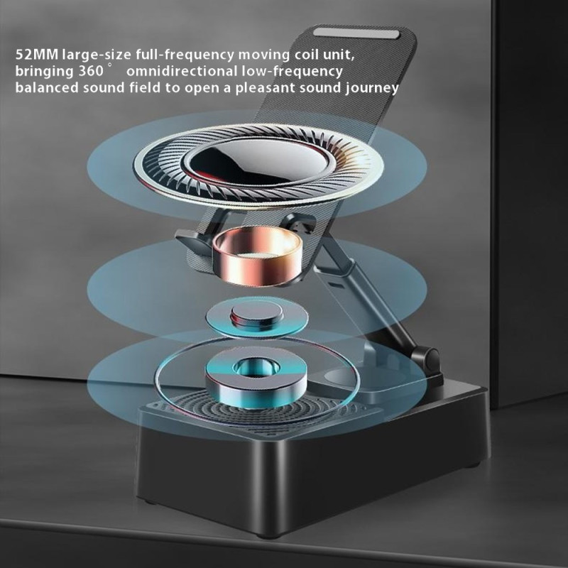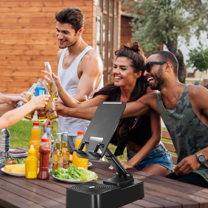 Support ajustable multifonction avec enceinte 5W intégrée et batterie de secours 1200mAh. Rotation 360°, Bluetooth 5.1, design pliable ultra-compact. Idéal pour le streaming audio, les appels vidéo et le rechargement d'urgence en déplacement.
