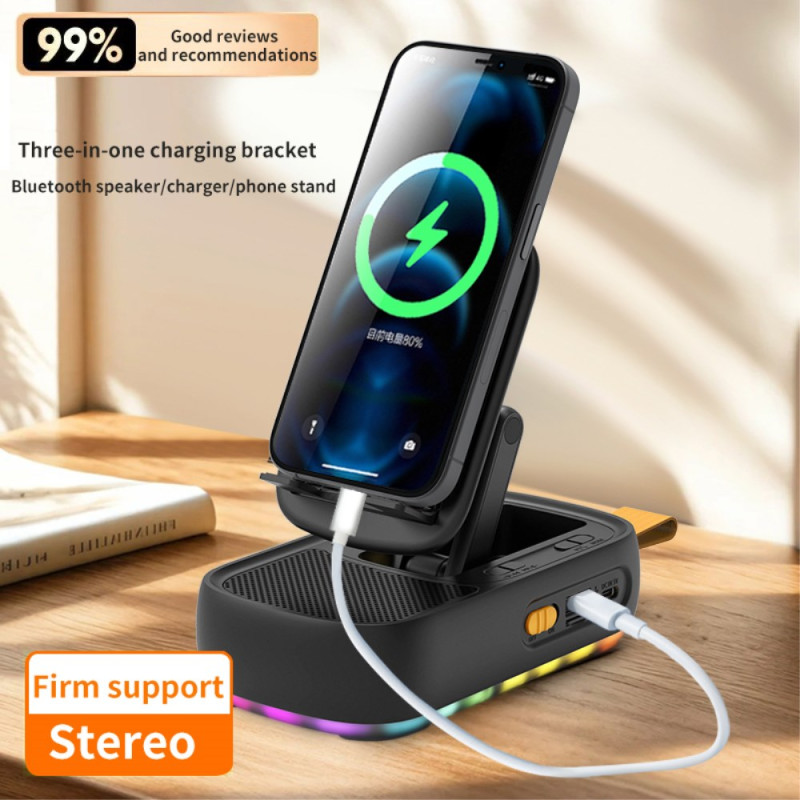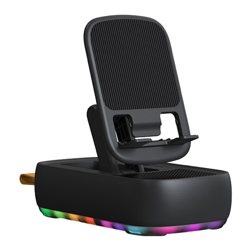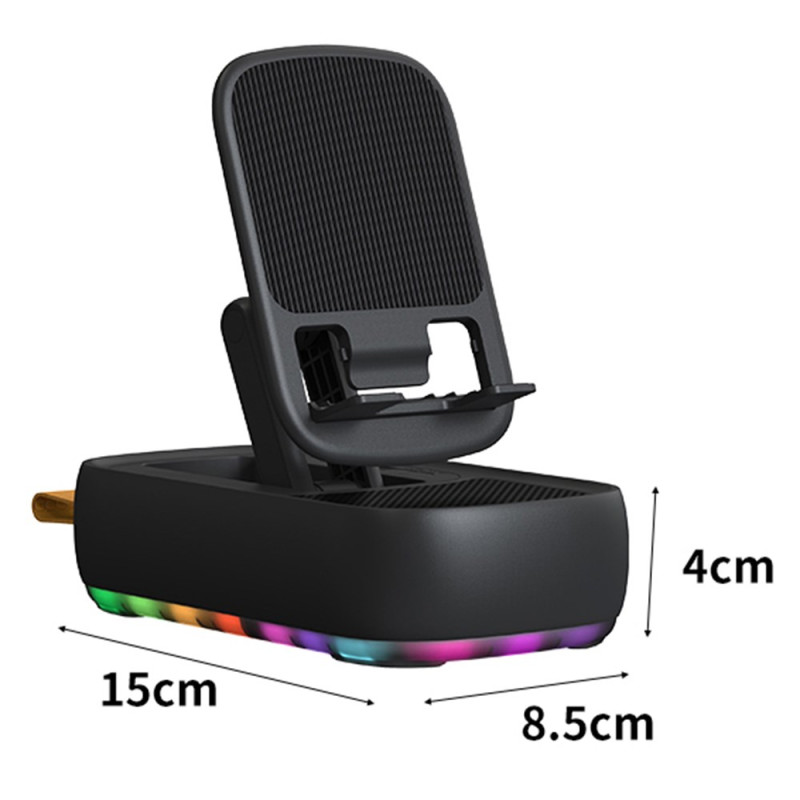 Découvrez le support F15 3-en-1 : support de téléphone ajustable, enceinte Bluetooth 5W avec son surround 3D et batterie externe 1200mAh. Design pliable à 360°, éclairage d'ambiance 7 couleurs et contrôles intuitifs. Parfait pour le bureau et les déplacements.