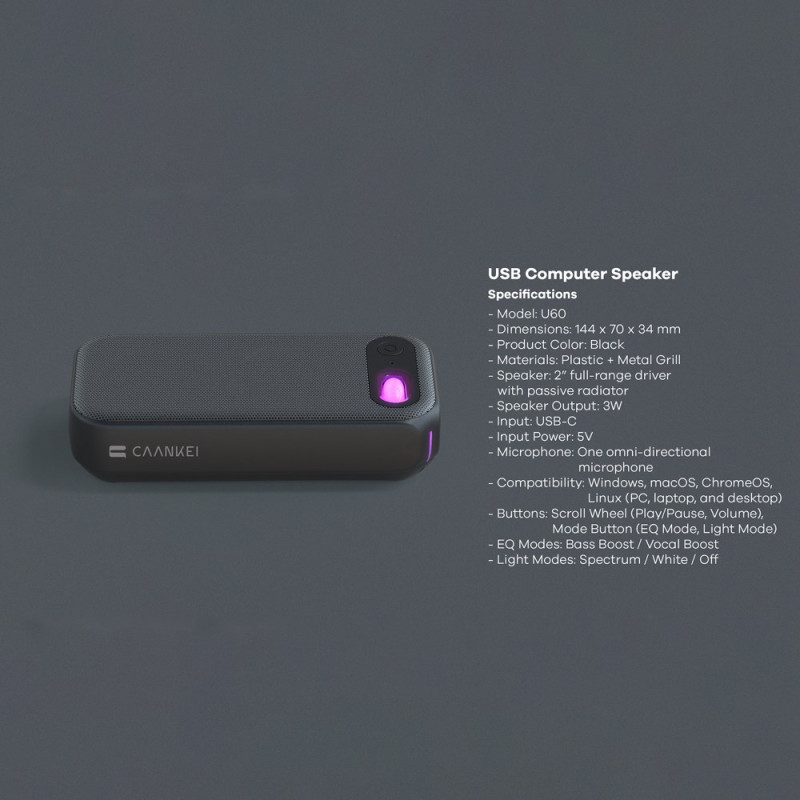 El altavoz U60 ofrece una solución de audio profesional plug-and-play con conectividad USB-C para Windows, macOS, ChromeOS y Linux. Su controlador de rango completo de 2 pulgadas, reforzado por dos radiadores pasivos, ofrece un sonido claro y envolvente, ideal para llamadas, reuniones y presentaciones. El micrófono omnidireccional con DSP reduce eficazmente el ruido ambiente para garantizar una comunicación cristalina. Dos modos de ecualizador permiten adaptar la experiencia de sonido, mientras que una rueda selectora específica facilita el control del volumen y la reproducción.
