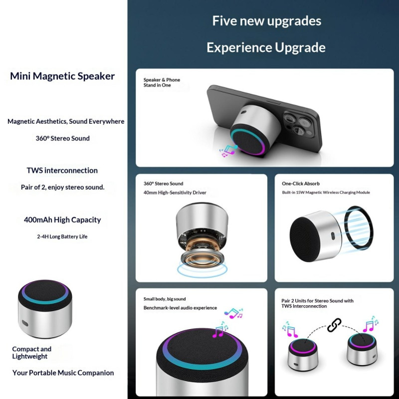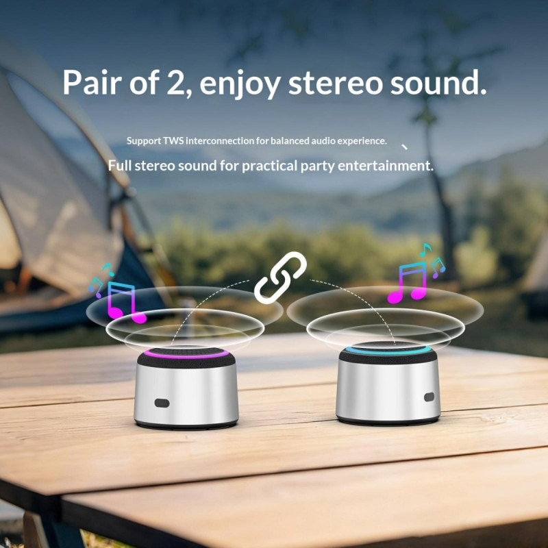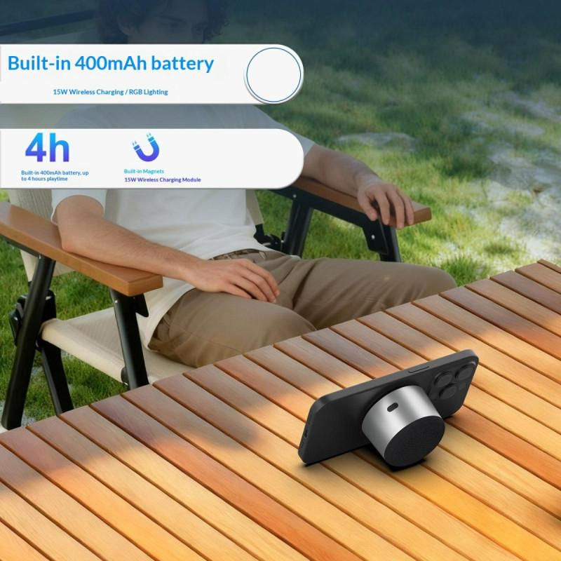 Este altavoz compacto combina iluminación RGB, carga inalámbrica de 15 W y funcionalidad TWS para ofrecer una experiencia de audio completa en un paquete pequeño. Su soporte magnético permite acoplar un smartphone para utilizarlo como manos libres, ideal para ver vídeos, hacer llamadas o escuchar música. Con un transductor de 40 mm y 5 W de potencia, ofrece un sonido nítido a pesar de sus dimensiones en miniatura. La conectividad Bluetooth 5.4 garantiza una transmisión estable, mientras que la duración de la batería, de dos a cuatro horas, es ideal para el uso diario. Perfecto para el escritorio, la mesilla de noche o para llevar.