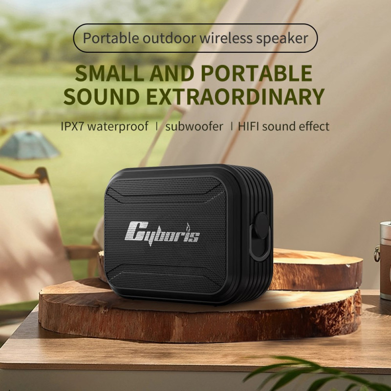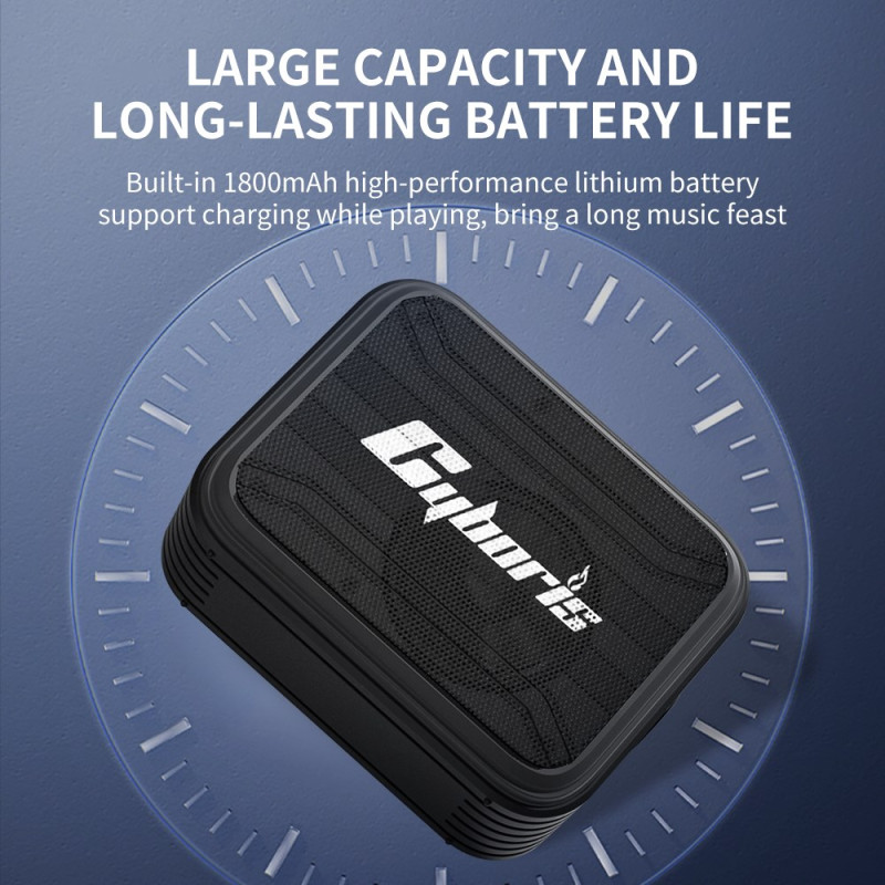 Este altavoz CYBORIS compacto y resistente al agua IPX7 ofrece un uso versátil tanto en exteriores como en casa. Su altavoz de 15 W asegura una escucha clara y potente, mientras que la conexión Bluetooth 5.3 garantiza una transmisión estable incluso en movimiento. Gracias a su batería de 1800 mAh, dura más de doce horas a volumen moderado. Admite varias fuentes de audio, como U disk, tarjeta TF y AUX, e incorpora funciones avanzadas como radio FM, grabación de voz y reproducción en bucle. Su cordón integrado facilita su transporte, lo que lo convierte en un práctico compañero para la playa, la piscina o de viaje.