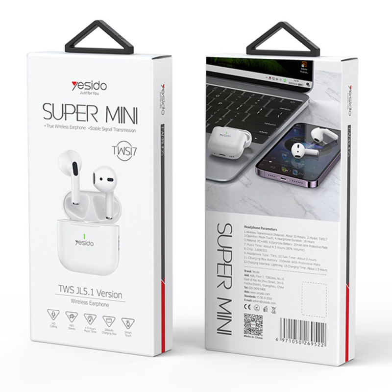 Los miniauriculares YESIDO TWS17 ofrecen una conexión estable hasta diez metros en un entorno abierto, lo que garantiza un uso fluido en movimiento. Los transductores de 13 mm y la impedancia de 32 Ω garantizan un sonido rico y claro para disfrutar escuchando. La duración de la batería es de unas 4,5 horas, con hasta dieciséis horas acumuladas con el estuche de carga. Los auriculares se recargan en una hora y media y el cargador en dos horas. El chip Bluetooth 5.1 JL6983 garantiza una transmisión eficaz con un bajo consumo de energía.
