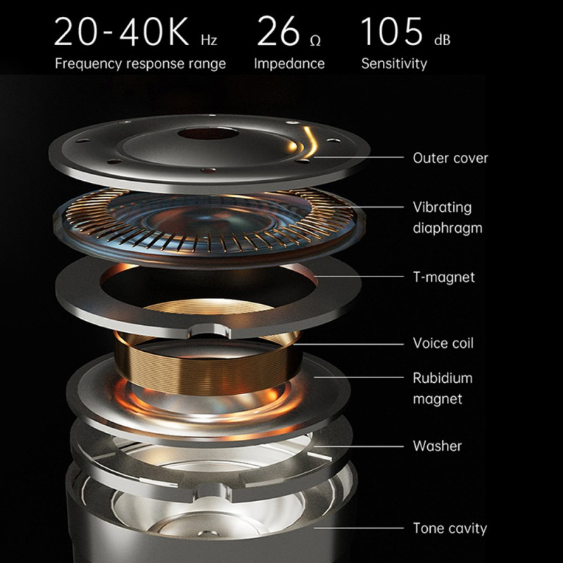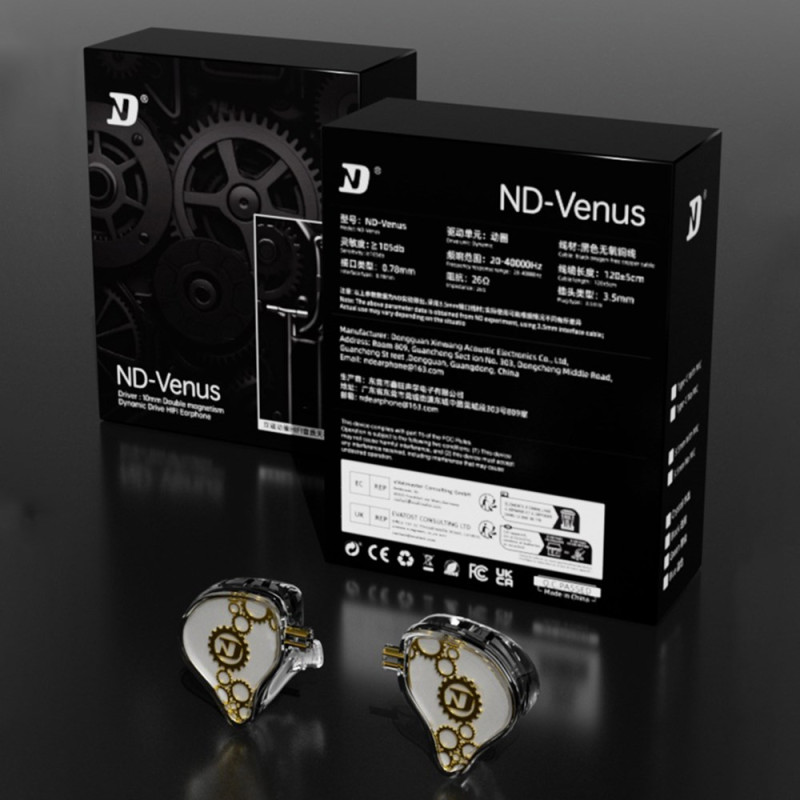 Los auriculares ND Venus utilizan un transductor dinámico con doble diafragma magnético, diseñado para ofrecer una reproducción de sonido detallada y potente, con una notable claridad en las voces y una extensión limpia hasta 40 kHz. Su arquitectura interna se basa en un ajuste acústico multicapa y una cavidad posterior ventilada, que optimiza la presión del aire para potenciar el impacto y mejorar la dinámica. El cable desmontable de doble clavija (0,75-0,78 mm) permite su sustitución o actualización. Inspirado en la estética mecánica, el diseño presenta formas industriales finas y precisas, mientras que el diseño ergonómico garantiza un ajuste estable y cómodo.
