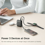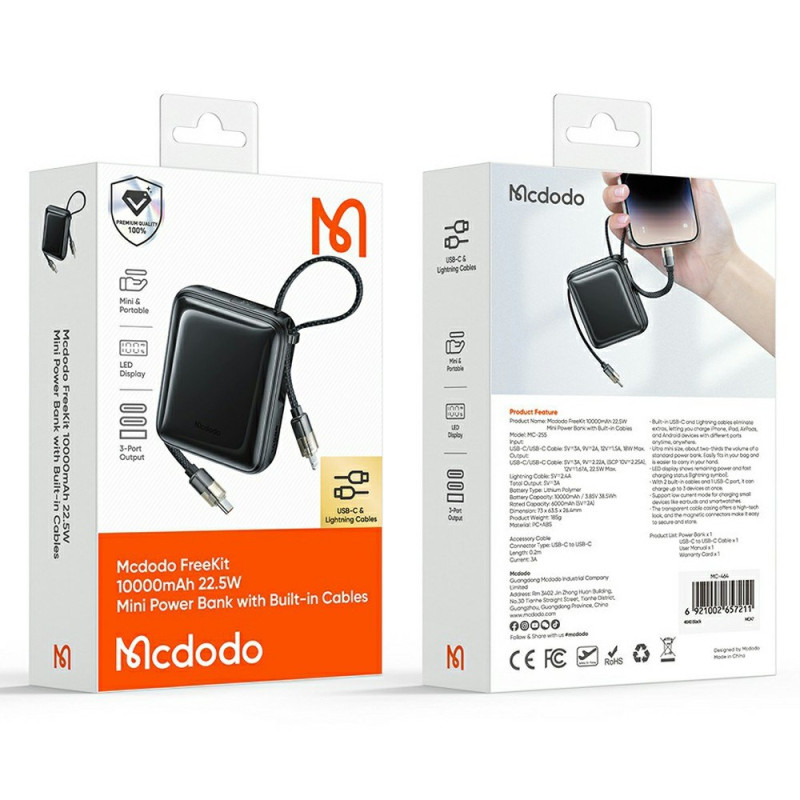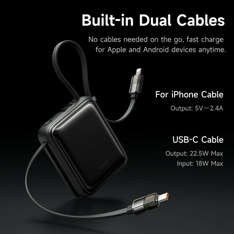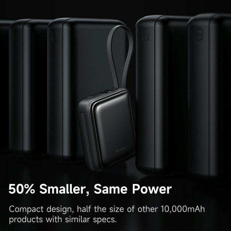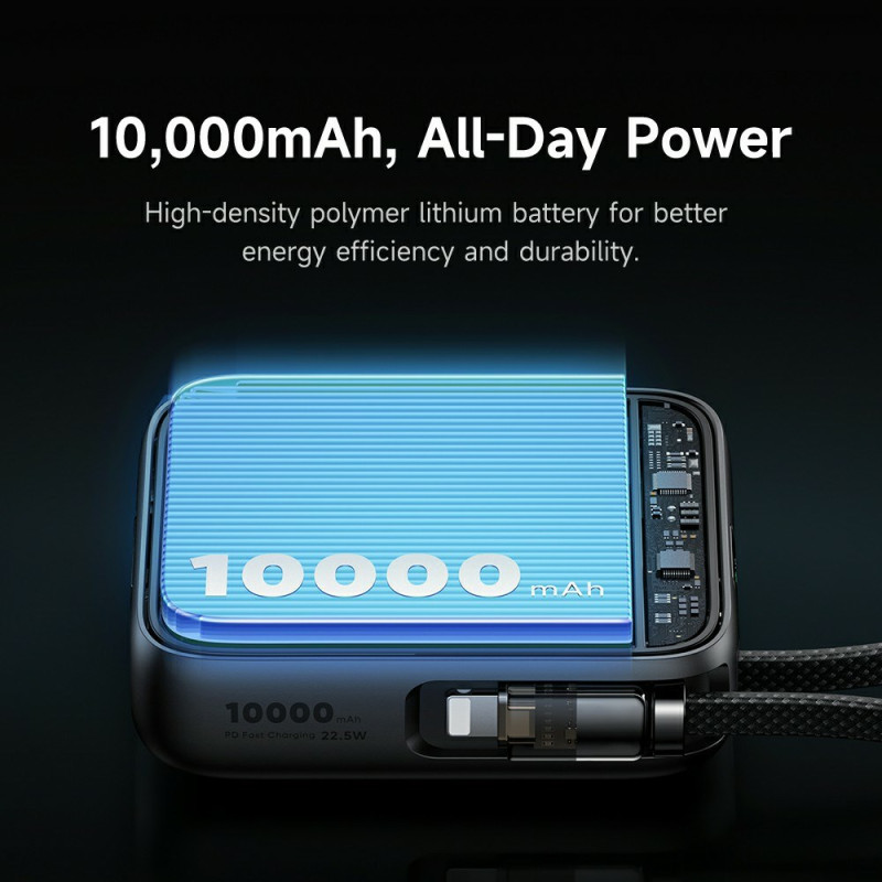 La potencia de alta capacidad y el tamaño ultracompacto se combinan ahora en esta solución de alimentación portátil. Esta batería externa de 10000 mAh está diseñada para ocupar el mínimo espacio gracias a su tamaño en miniatura (73 x 63,5 mm) y sus cables integrados. Ofrece una potencia de salida máxima de 22,5 W, lo que garantiza una carga ultrarrápida de sus dispositivos. La recarga de la propia batería se optimiza con una entrada rápida de 18 W. La pantalla digital permite controlar con precisión el nivel de carga, garantizando una gestión de la vida útil de la batería sin esfuerzo.