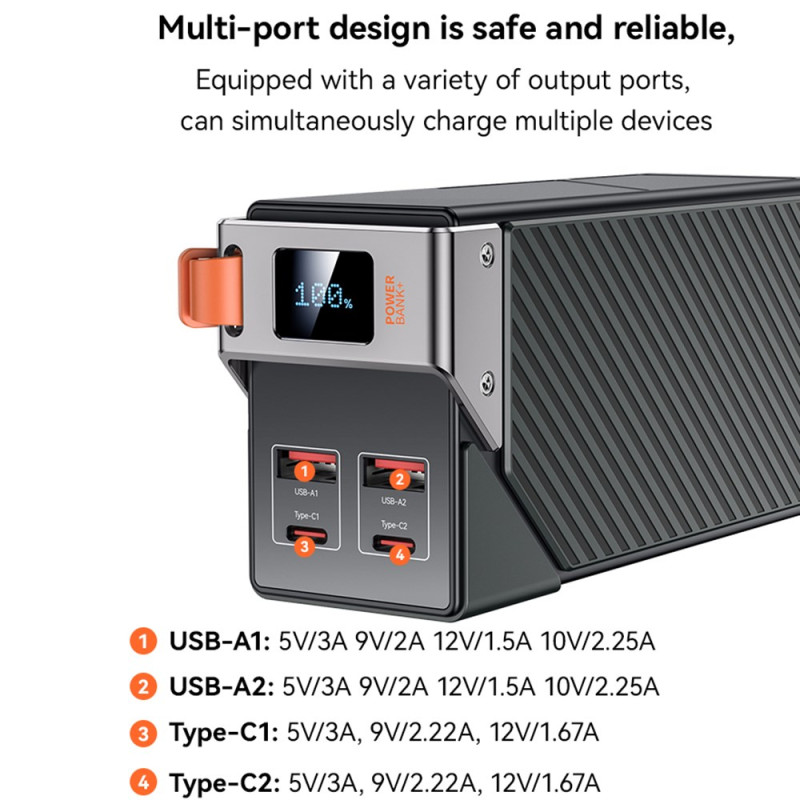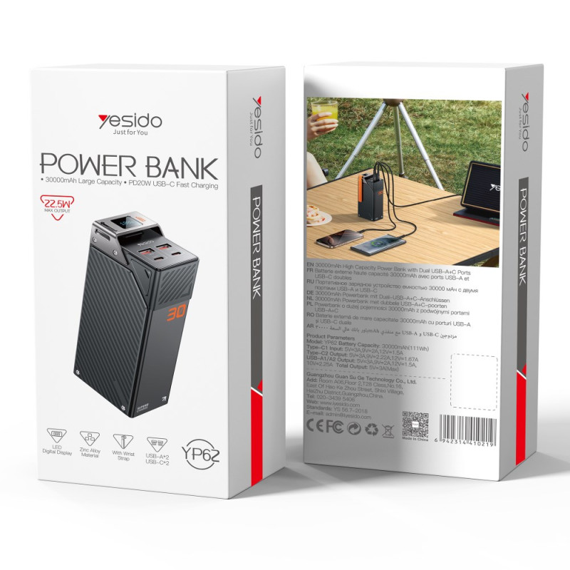 Gestionar una duración excepcional de la batería nunca ha sido tan versátil gracias a los cuatro puertos de esta unidad de 30000mAh. Esta batería externa YESIDO proporciona una alimentación fiable y prolongada para todos tus dispositivos. Proporciona hasta 22,5 W de potencia de carga rápida a través de sus salidas USB-A y Type-C. El diseño incorpora aleación de zinc y PC/ABS para una mayor durabilidad y un acabado premium. Equipado con un chip de solución inteligente SW6236, garantiza una seguridad óptima durante la carga. Toda la unidad cuenta con las certificaciones CE y ROHS, que acreditan su conformidad con los requisitos de seguridad europeos.