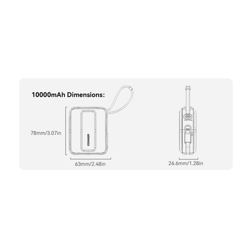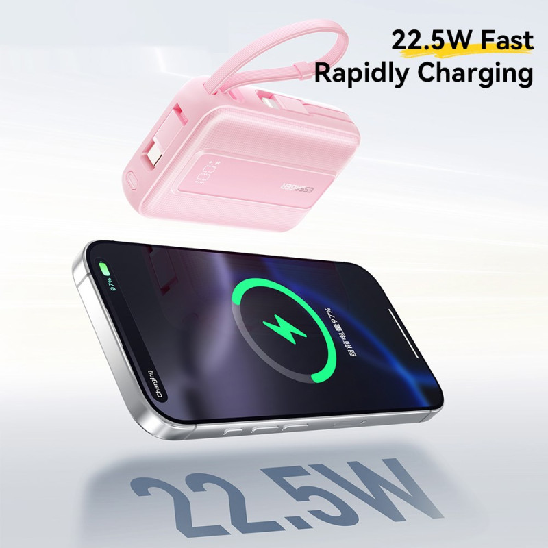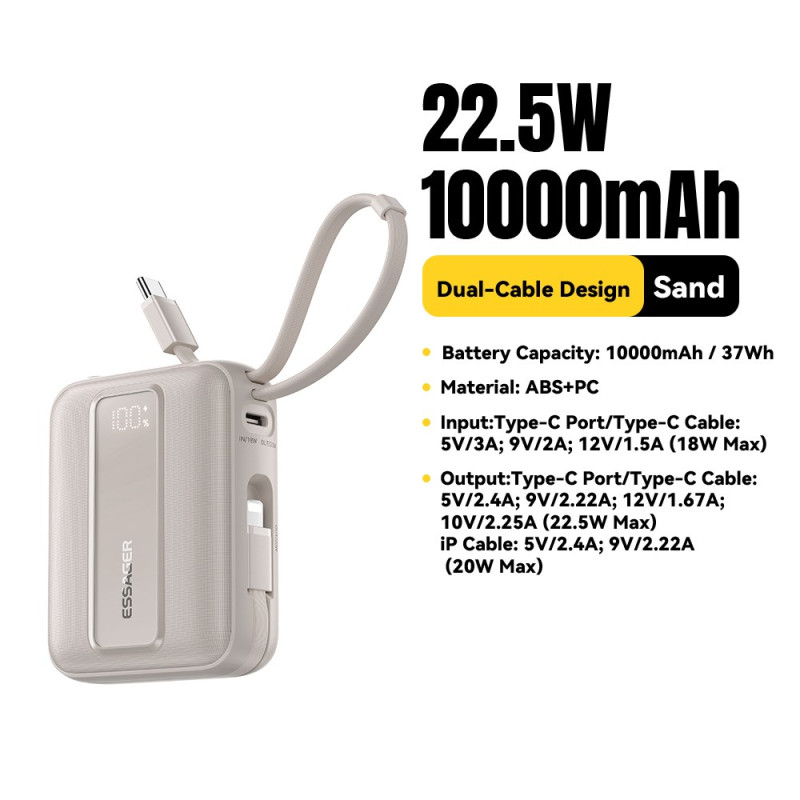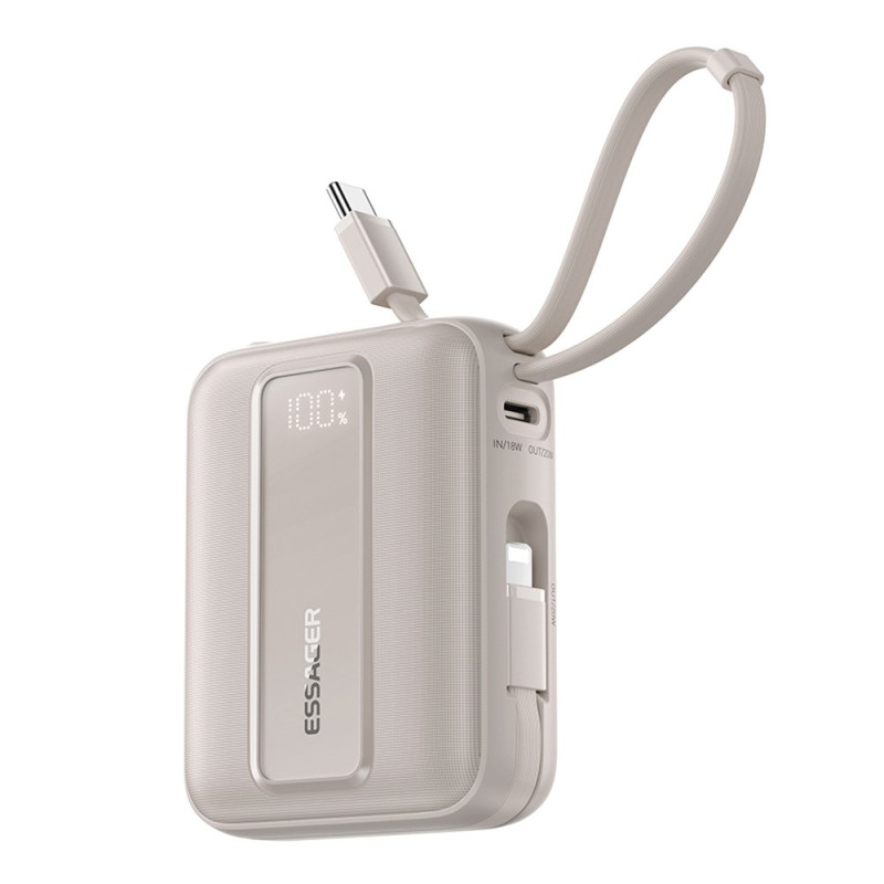 La gestión optimizada de tus dispositivos y la carga multiestándar ahora están disponibles en un formato compacto. Esta batería externa ESSAGER de 10000 mAh elimina el desorden gracias a la integración de cables Type-C y Lightning, lo que garantiza la compatibilidad universal. Ofrece hasta 22,5 W de potencia de carga rápida, lo que permite cargar hasta tres dispositivos simultáneamente. El sistema incorpora 7 capas de protección de circuitos y control inteligente de la temperatura para una carga segura y fiable. La pantalla digital inteligente proporciona un control claro y preciso de la duración de la batería. El sistema cumple las normas CE y RoHS, lo que demuestra su fiabilidad para el mercado europeo.