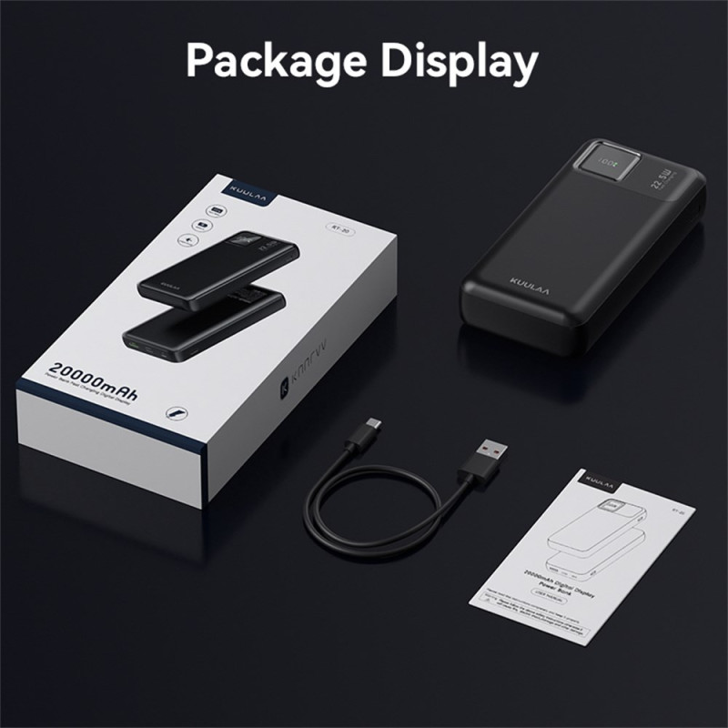 La capacidad de proporcionar una autonomía extendida y múltiples recargas sin comprometer la seguridad define a esta unidad de KUULAA. Esta batería externa de 20000 mAh es una pieza esencial para los usuarios más exigentes. Ofrece hasta 22,5 W de potencia de carga rápida a través de sus puertos USB-A y Tipo-C, lo que permite alimentar de forma eficaz varios dispositivos simultáneamente. Su diseño compacto y ligero (139,6 x 68 mm) está optimizado para los viajes. La seguridad está garantizada por los mecanismos integrados de protección contra sobrecargas y cortocircuitos. El dispositivo cuenta con las certificaciones CE, RoHS y UL, que acreditan su conformidad con las normas internacionales y europeas.