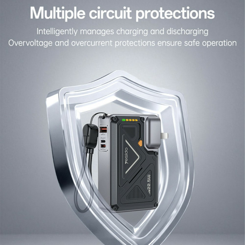La integración de un cargador de pared y una batería inalámbrica en una sola unidad resuelve los retos de la carga en múltiples escenarios. Esta batería externa YESIDO ofrece doble funcionalidad CA/CC para la máxima versatilidad. Proporciona una carga inalámbrica magnética de hasta 15 W y una carga rápida por cable de 22,5 W (a través de USB). El dispositivo incluye un soporte integrado para la visualización horizontal mientras se carga. La seguridad está garantizada por chips de gestión inteligente y una construcción de PC ignífuga V0. Cuatro indicadores LED claros proporcionan una supervisión precisa e instantánea del estado de carga.