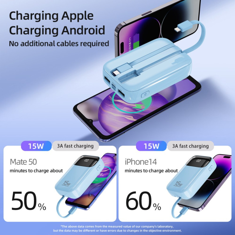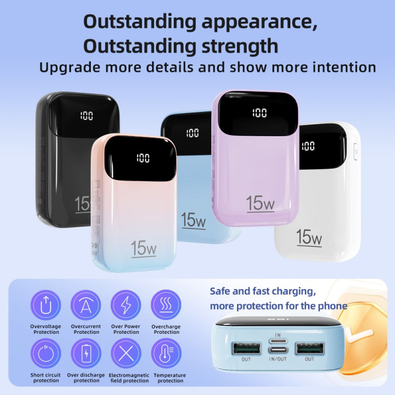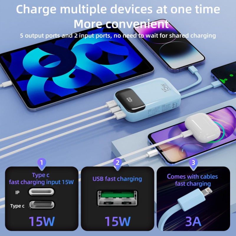 La dependencia de cables externos desaparece con esta Batería Externa ROISKIN, diseñada para una autonomía y eficiencia compartidas. Su colosal capacidad de 20.000 mAh garantiza energía para múltiples dispositivos durante días enteros. Su diseño integra cables Type-C y Lightning (iP), ofreciendo compatibilidad inmediata con todos los ecosistemas. Con cinco salidas disponibles (puertos y cables), esta unidad permite cargar simultáneamente un gran número de dispositivos. Su construcción en PC ofrece un tacto agradable y su protección inteligente garantiza un uso fiable. El dispositivo cuenta con la certificación CE-RoHS, lo que confirma su conformidad con las normas europeas.