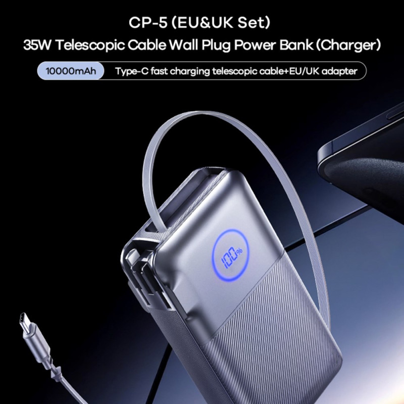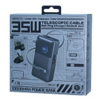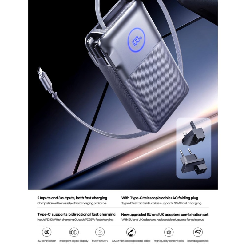 Diseñada para simplificar tus viajes, esta batería externa combina un cargador de pared, un cable Type-C retráctil y adaptadores UE/UK en una sola unidad compacta. Sus 35 W de potencia permiten recargar rápidamente tanto los dispositivos como la propia batería externa. El diseño plegable facilita su almacenamiento, mientras que la pantalla LED proporciona una lectura clara de los niveles de energía. Gracias a sus fiables celdas de polímero, garantiza una carga estable y segura estés donde estés.