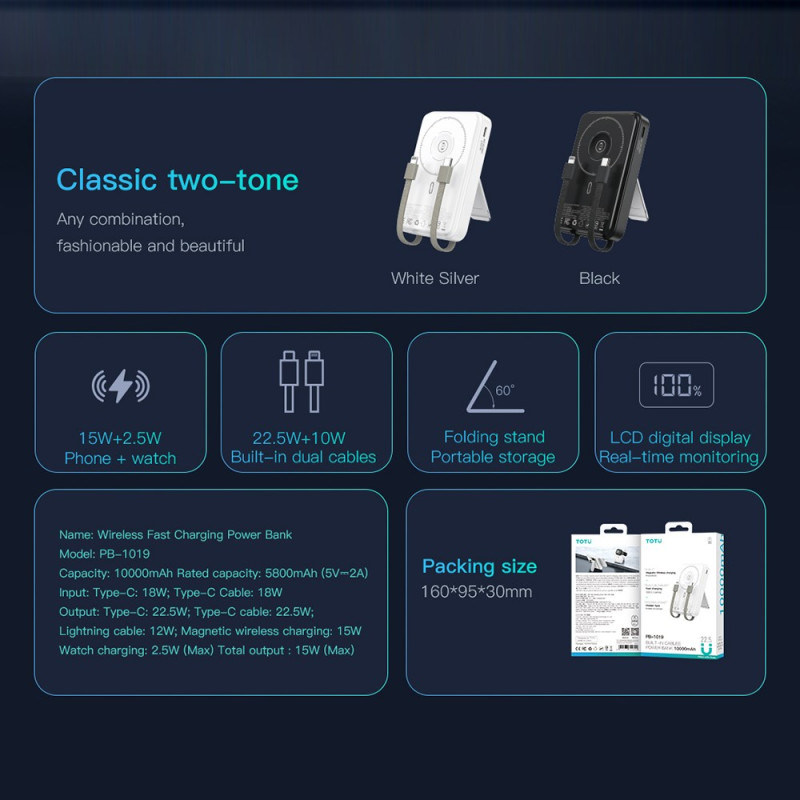 Esta batería externa magnética combina potencia y practicidad para acompañar a tus dispositivos todos los días. Con sus 10000 mAh, proporciona una cómoda autonomía, mientras que la carga inalámbrica magnética de hasta 15 W facilita la alimentación rápida de smartphones compatibles. El puerto Type-C y los cables integrados ofrecen diversas opciones de carga, incluido un modo específico para relojes conectados. Su soporte integrado permite colocar el teléfono en una posición estable mientras se carga, ideal para ver un vídeo o consultar notificaciones.