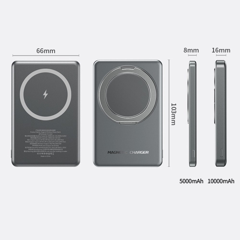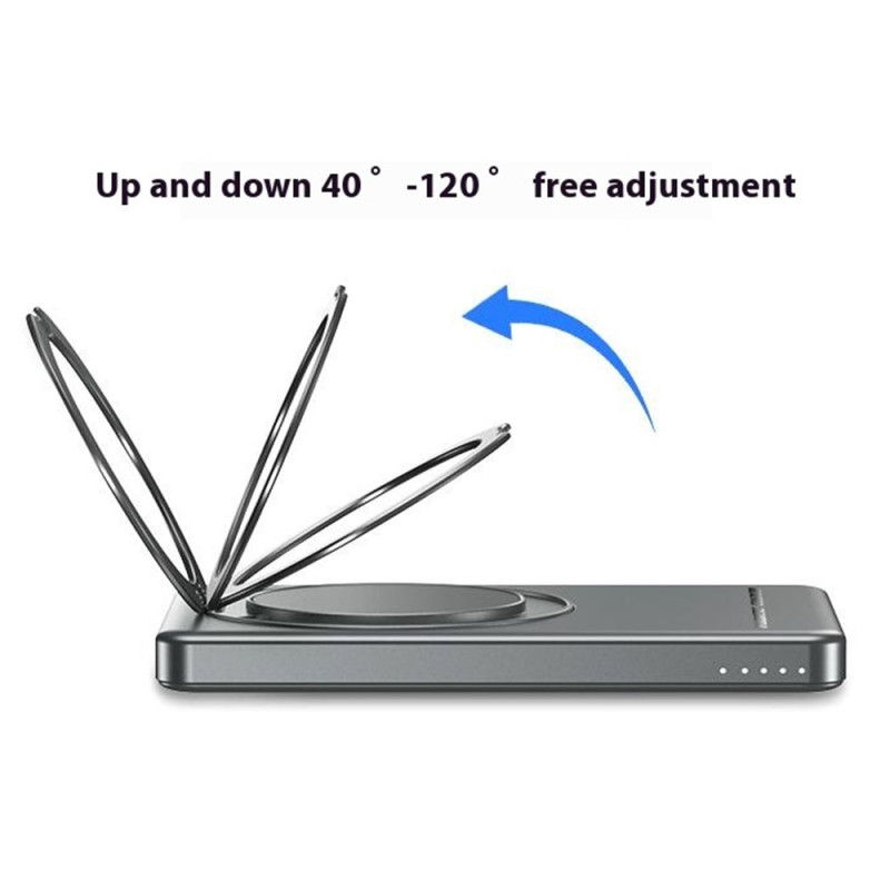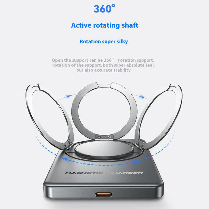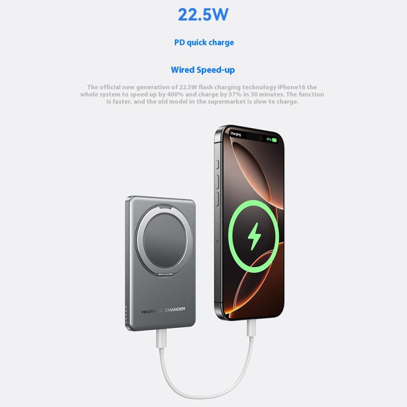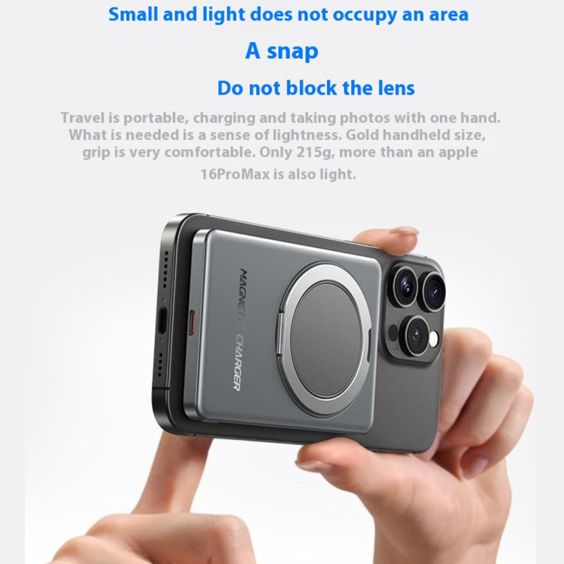Esta batería externa magnética de 10000 mAh ofrece una potente carga inalámbrica de hasta 15 W gracias a una fijación magnética reforzada. Se acopla directamente a la parte posterior de los iPhones compatibles con MagSafe para un uso sencillo y estable. El modo de carga dual, inalámbrica o con cable de hasta 22,5 W, permite alimentar diferentes dispositivos rápidamente. Su pantalla LED muestra claramente el nivel de energía y el estado de carga. El anillo metálico integrado sirve tanto de soporte plegable como de asa antideslizante, ideal para ver contenidos o asegurar el agarre. Su formato compacto de aluminio lo convierte en un práctico accesorio para el día a día.