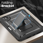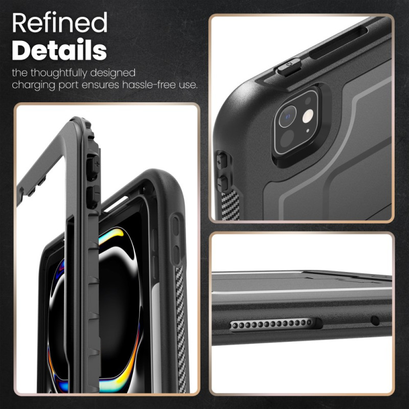 Esta funda resistente para iPad Pro 11 (2025) / 11 (2024) ofrece una protección duradera con su mezcla de PC y TPE. Incluye un soporte plegable de aleación de zinc, almacenamiento para el lápiz óptico, recortes precisos para acceder fácilmente a todas las funciones, un protector de cámara elevado y una colgante desmontable para el hombro que facilita el transporte.
