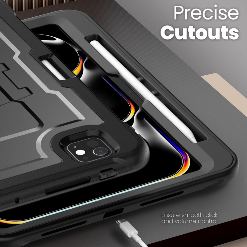 Protege tu iPad Pro 11 (2025) / 11 (2024) con nuestra funda robusta y versátil. Fabricada con materiales duraderos, ofrece una excelente resistencia a arañazos e impactos. El soporte integrado permite ver cómodamente con las manos libres, mientras que el compartimento para el lápiz óptico y los precisos recortes garantizan practicidad y plena funcionalidad.