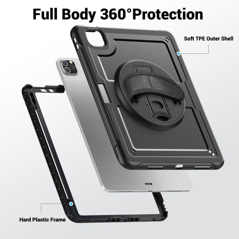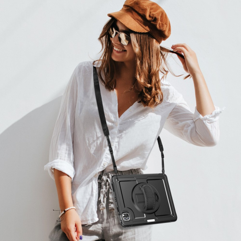 Descubre nuestra robusta funda para iPad Pro 11 (2025) / 11 (2024) con soporte giratorio de 360°, colgante de mano ajustable y bandolera desmontable. Fabricada en PC y TPE, ofrece una protección excepcional contra arañazos y golpes. El soporte giratorio la hace versátil, mientras que la colgante de mano garantiza un agarre cómodo y seguro.