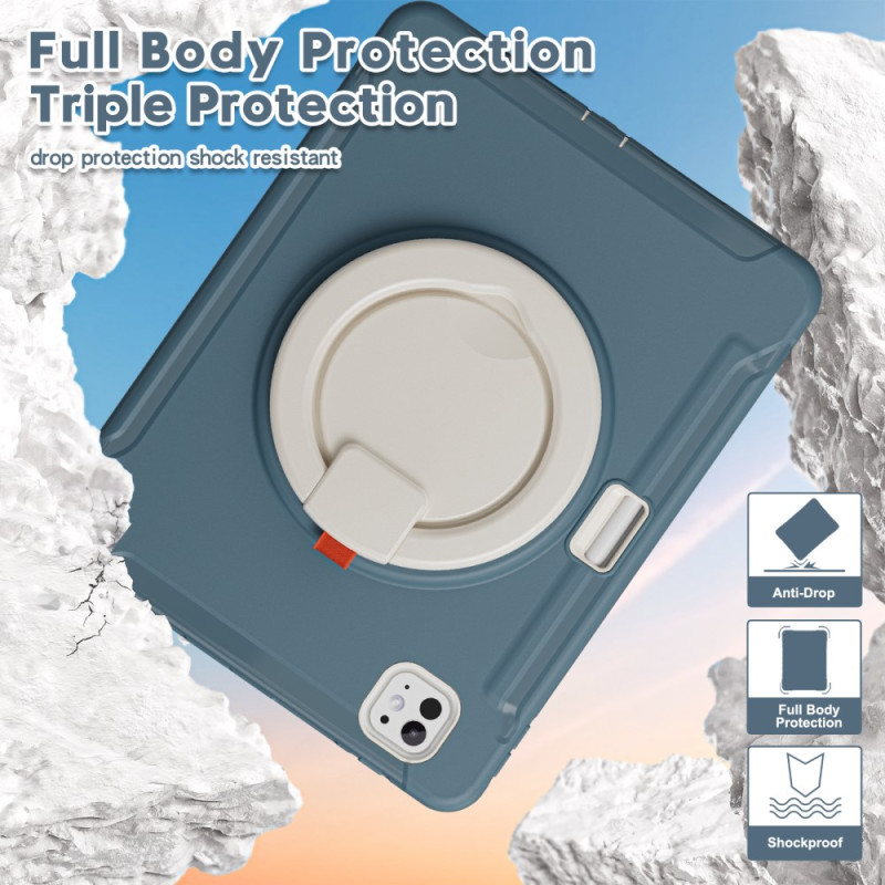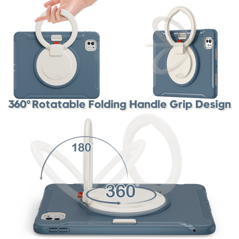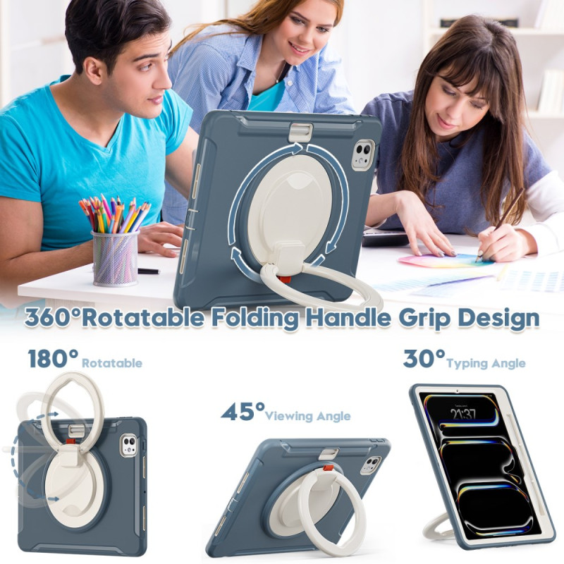 Descubre nuestra innovadora funda protectora para iPad Pro 11 (2025) / 11 (2024). Con un asa giratoria de 360 grados y un soporte integrado, ofrece una protección óptima gracias a su robusta estructura de triple capa. Disfruta de una protección completa frente a golpes y caídas, al tiempo que te beneficias de un práctico almacenamiento para tu lápiz óptico.