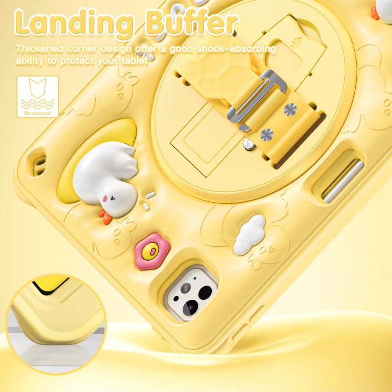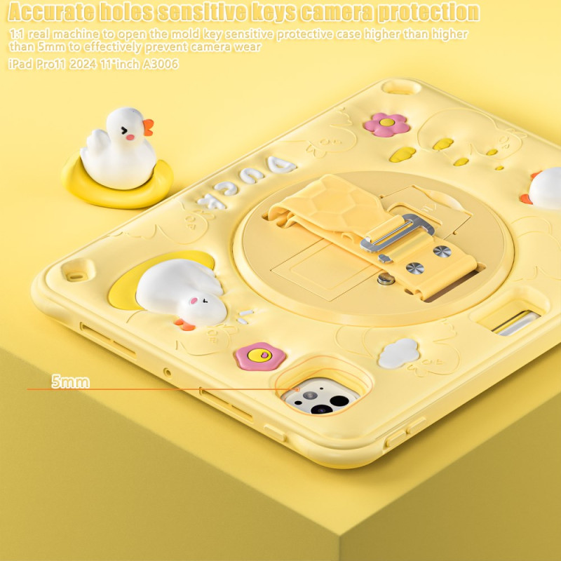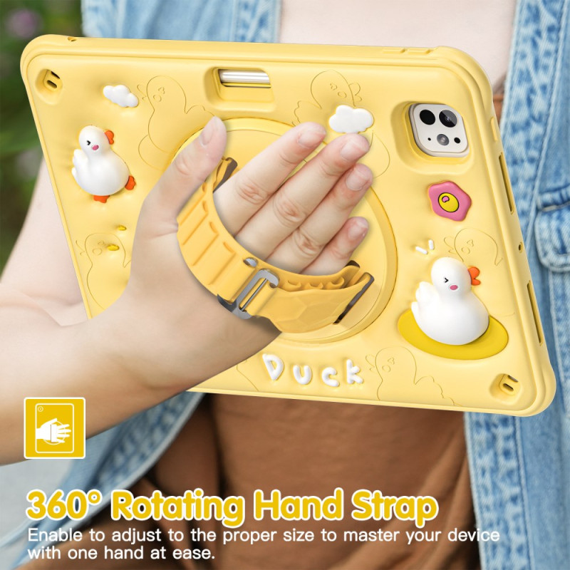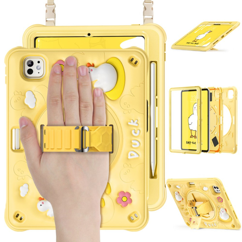 Descubre nuestra innovadora funda para iPad Pro 11, que combina protección y estilo. Con un práctico soporte, colgante desmontable y un adorable diseño de pato, ofrece protección multicapa con esquinas reforzadas. El asa giratoria 360° proporciona un agarre cómodo, ideal para el uso diario.