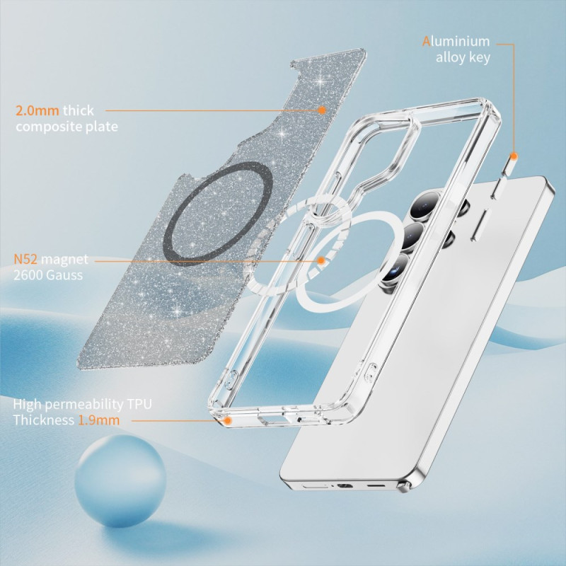 Protégez votre Samsung Galaxy S26 Ultra avec élégance grâce à cette coque magnétique transparente à paillettes. Conçue en PC et TPU résistant aux chocs, elle offre une protection complète tout en conservant la beauté de votre appareil.