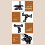 Diseñado específicamente para su uso en oficinas y la creación de contenidos, este soporte ofrece la estabilidad y versatilidad necesarias para las tomas aéreas. Fabricado en aleación de aluminio de alta calidad, proporciona una base estable y duradera, con un peso de unos 550 gramos. La columna metálica es extensible, lo que ofrece un posicionamiento versátil para tomas subacuáticas. retransmisión en directo o tutoriales. Su diseño compacto facilita su transporte e instalación en cualquier lugar. Es compatible con smartphones de hasta 6 pulgadas y ofrece ángulos de visión óptimos gracias a su diseño ajustable.