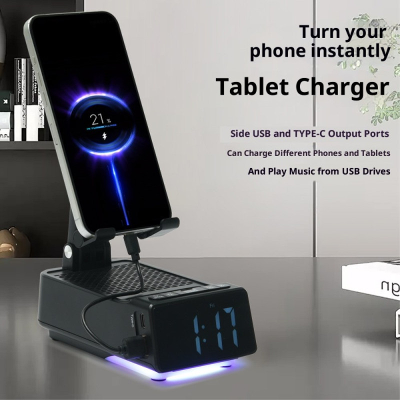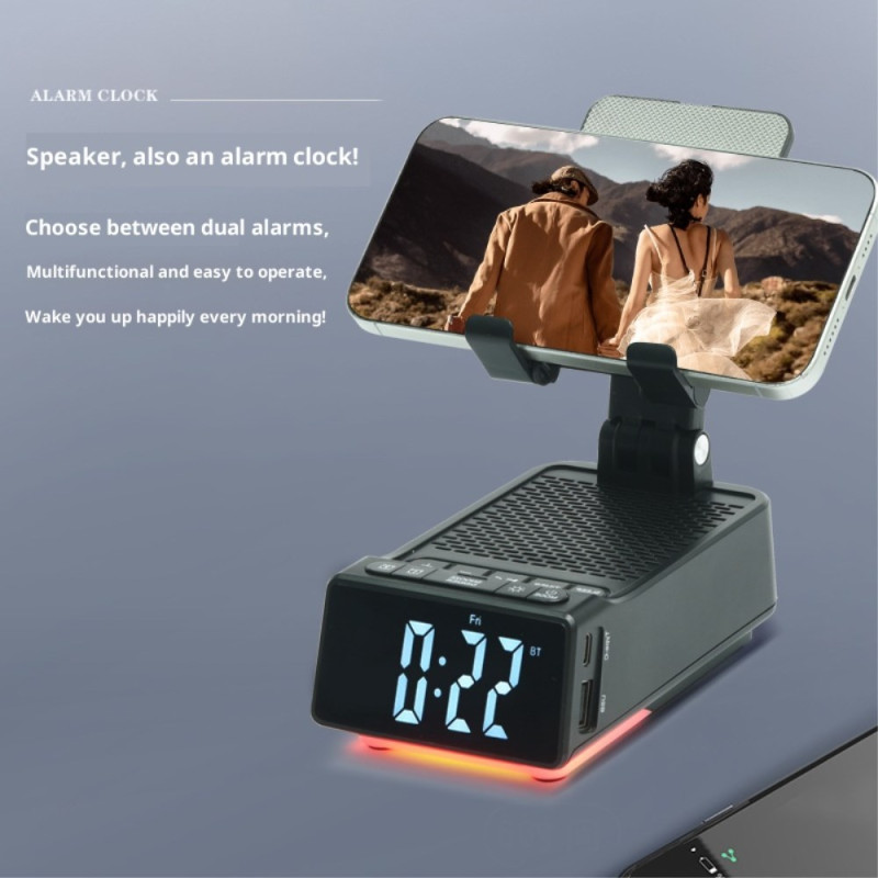 La experta convergencia de iluminación, gestión del tiempo y entretenimiento sonoro define este dispositivo multifuncional. Esta estación 4 en 1 incorpora un altavoz Bluetooth 5.1 para un sonido rico en 360° y un reloj digital con doble alarma. Su soporte es ajustable en 180 grados, lo que permite una visualización ergonómica en modo vertical y horizontal. La iluminación ambiental ofrece siete modos dinámicos (degradado, respiración, colores fijos), que crean una atmósfera relajante. La batería integrada de 2000 mAh proporciona hasta 4 horas de reproducción inalámbrica continua.
