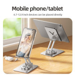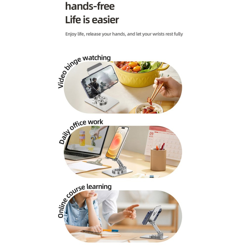 El soporte de sobremesa plegable y giratorio L11 es excepcionalmente cómodo de usar, con tres ejes giratorios para ajustar con precisión la altura y el ángulo de visión. Fabricado en aleación de aluminio de alta calidad con base de acero al carbono y patas de silicona, garantiza la estabilidad y seguridad de sus dispositivos. Compacto y elegante, se adapta a todos los smartphones de hasta 6,4 pulgadas con un grosor máximo de 1,2 cm. Ideal para videollamadas, teletrabajar o ver contenidos, se pliega fácilmente para llevarlo a cualquier parte.