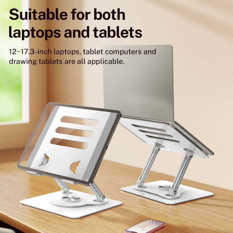 Este soporte para portátiles y tabletas combina robustez y facilidad de uso gracias a su diseño de acero al carbono y su sistema de rotación de 360°. Compatible con dispositivos de 12" a 17,3", permite ajustar la altura y el ángulo de visión para conseguir un puesto de trabajo ergonómico y personalizable. Su diseño calado permite que el aire circule libremente para una refrigeración óptima, incluso durante un uso prolongado. Plegable y fácil de transportar, se integra perfectamente en cualquier oficina o entorno doméstico para ofrecer una comodidad duradera en el día a día.