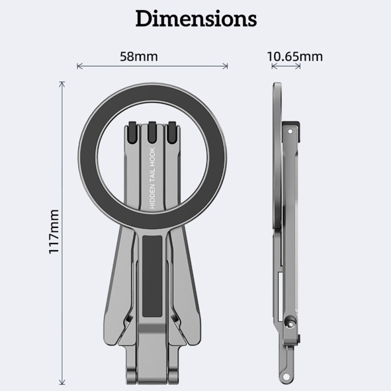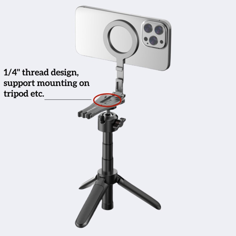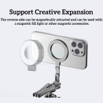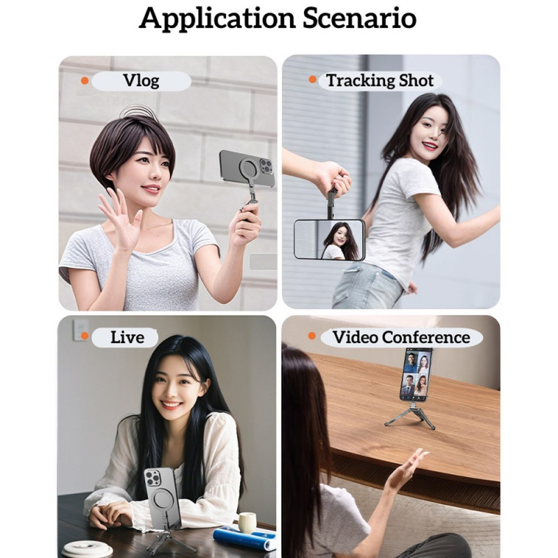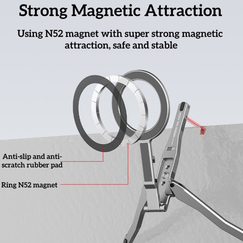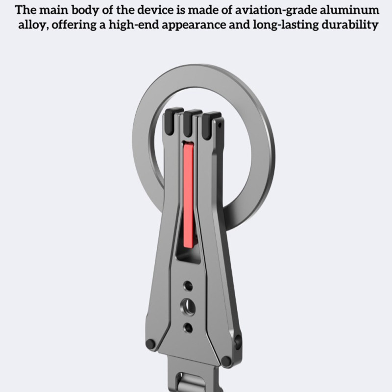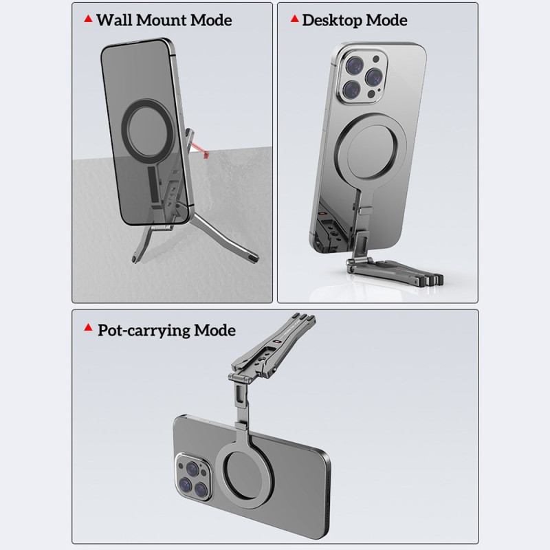 Este soporte magnético es un trípode plegable diseñado para ofrecer una experiencia manos libres versátil y ultrapráctica. Compatible con los iPhones 12 a 16 gracias a la adhesión magnética directa o a las fundas MagSafe, también puede alojar otros smartphones mediante el anillo magnético suministrado. Fabricado con una aleación de aluminio resistente y ligera, incorpora potentes imanes de aluminio-hierro-boro para una sujeción segura. Compacto cuando está plegado (117 × 58 × 10,65 mm) y con un peso de sólo 60 g, puede utilizarse como trípode, soporte de sobremesa o soporte inclinable, según sus necesidades.