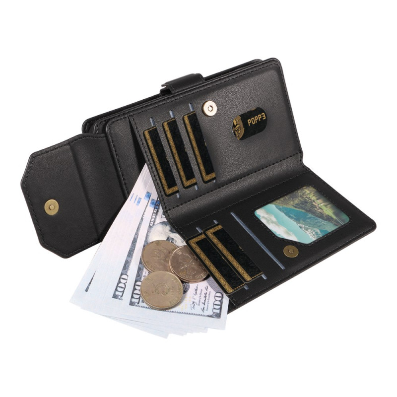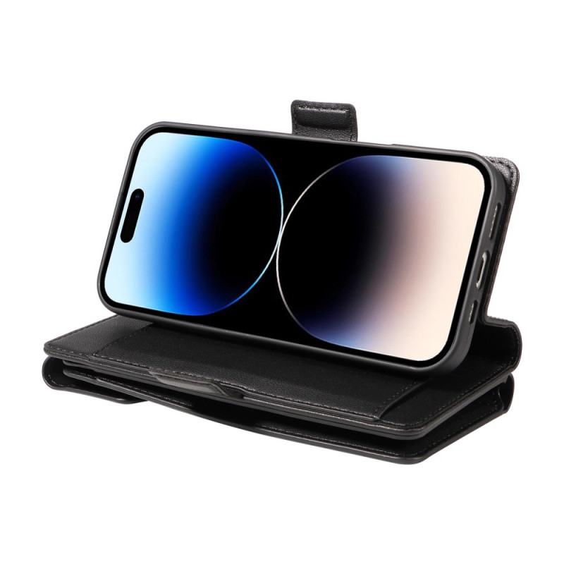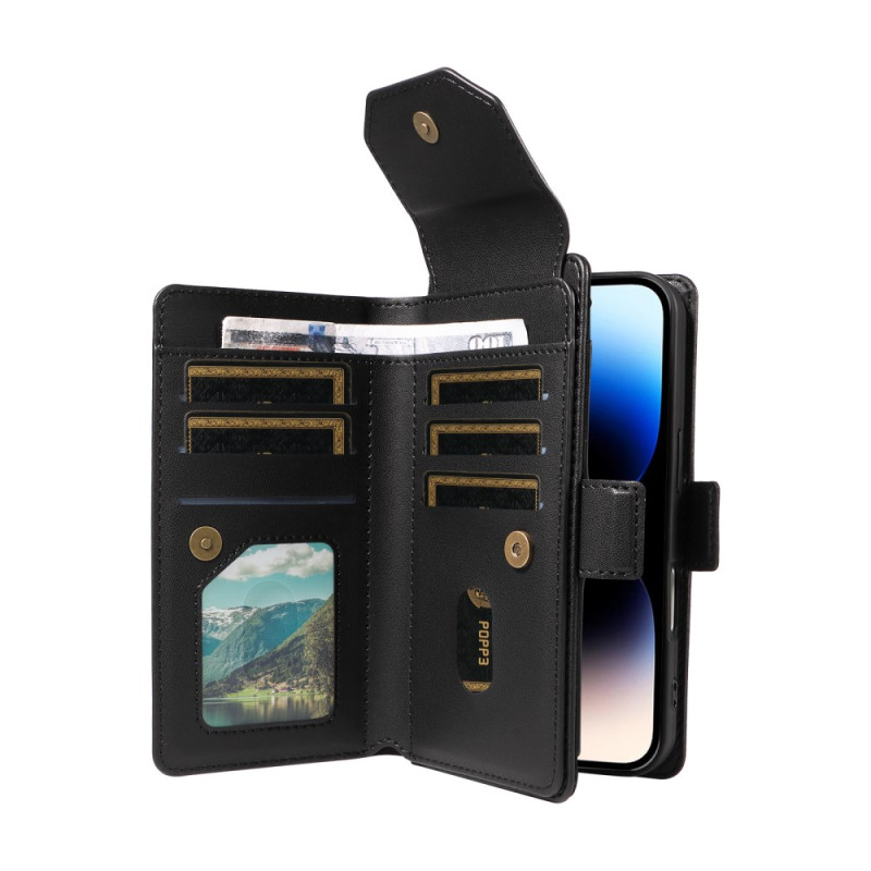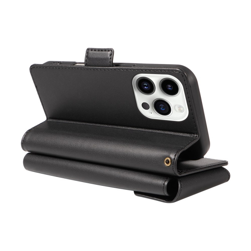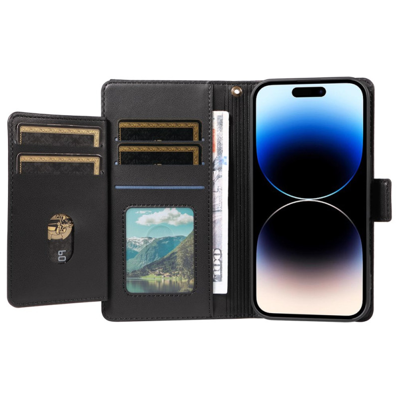 Funda cartera multifuncional de cuero PU para iPhone 14 Pro Max. Con múltiples ranuras para tarjetas, compartimentos para billetes, función de soporte integrada y colgante de mano extraíble. Cierre magnético seguro y recortes precisos para facilitar el acceso.
