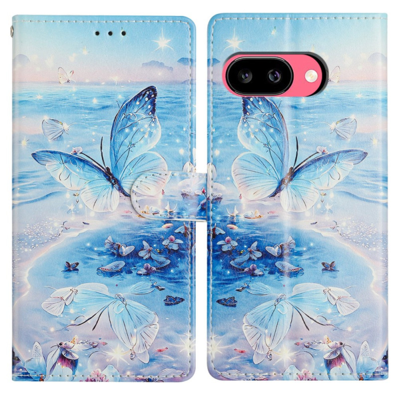 Elegante funda monedero para Google Pixel 10A con motivo de mariposa oceánica. Cuenta con 2 ranuras para tarjetas, 1 compartimento para fotos y un espacioso bolsillo lateral. Incluye soporte integrado para manos libres y colgante de mano desmontable.