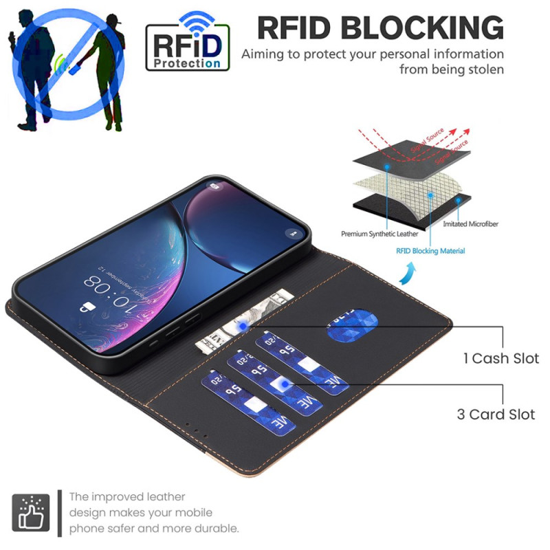 Sofisticado estuche de polipiel de primera calidad con tecnología de bloqueo RFID integrada. Con 3 ranuras para tarjetas y 1 compartimento para efectivo, combina elegancia y practicidad. Función de soporte integrada para una visión manos libres óptima.