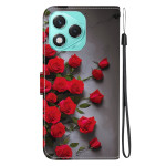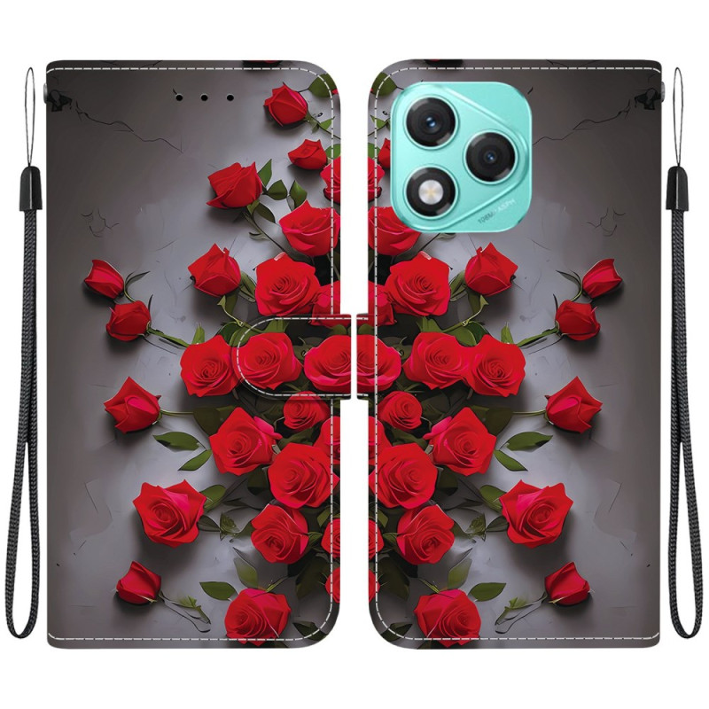 Elegante funda de piel sintética con estampado de rosas rojas para el Honor 400 Lite 5G. Cuenta con un soporte plegable, 2 ranuras para tarjetas, un compartimento para billetes y una colgante de mano extraíble. Cierre magnético seguro para una protección óptima.