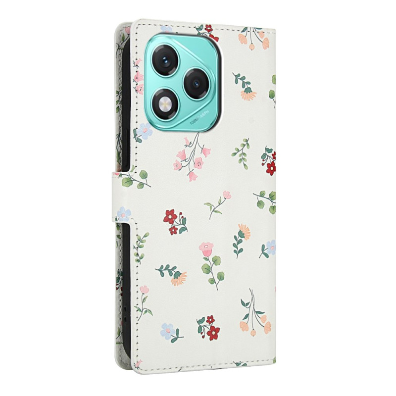 Elegante funda cartera para Honor 400 Lite 5G en piel de PU con funda interior de TPU flexible. Diseño sofisticado con motivos florales y acolchado de diamantes. Cuenta con múltiples ranuras para tarjetas, bolsillo para billetes, función de soporte ajustable y práctica colgante de mano.