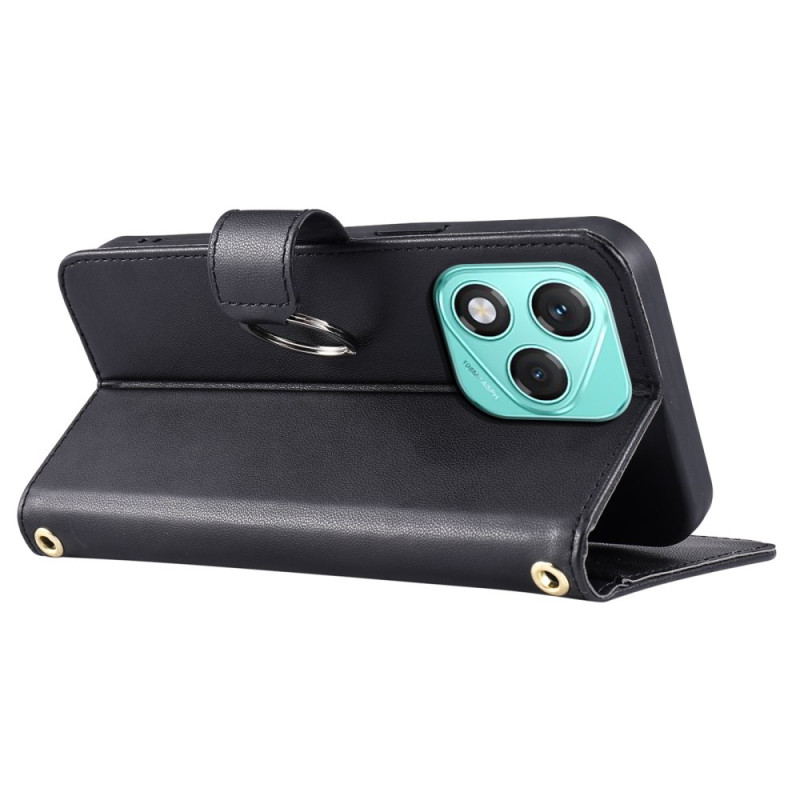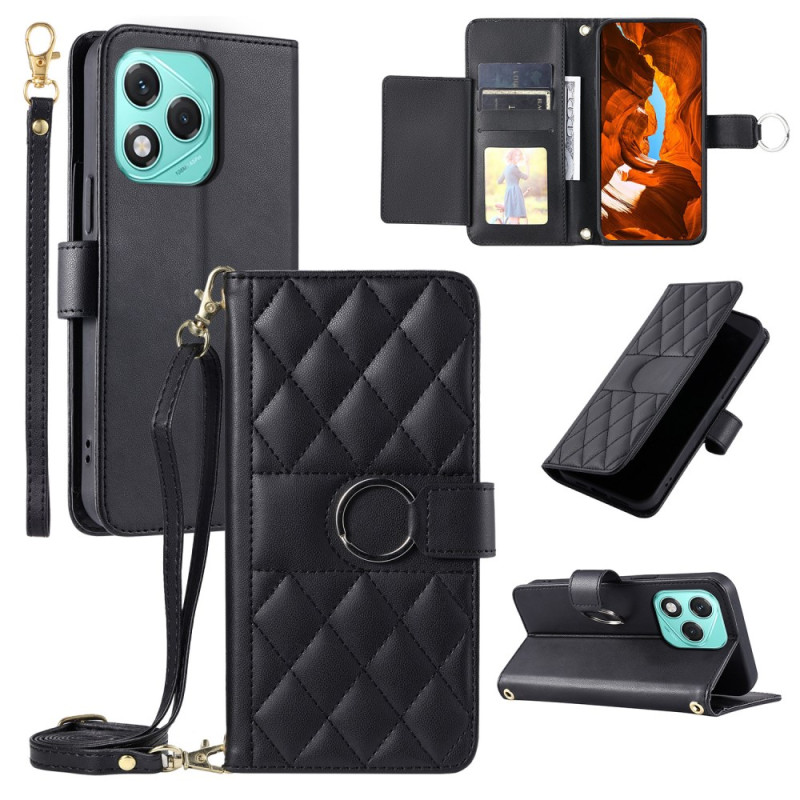 Elegante cartera en piel de PU de primera calidad con un sofisticado diseño acolchado. Incorpora una anilla metálica, soporte integrado, 5 ranuras para tarjetas y bolsillo monedero. Se entrega con 2 correas ajustables para llevarla en la mano o cruzada.