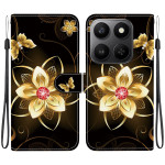 Elegante funda de cuero PU con diseño floral dorado para Honor 400 Smart 5G / 4G. Función de soporte integrada, cierre magnético seguro, bolsillos para tarjetas y compartimento para cartera. Viene con colgante desmontable para un transporte cómodo.