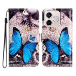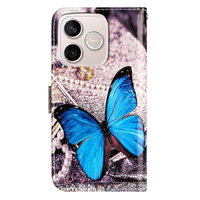 Elegante motivo de mariposa azul, ranuras para tarjetas, soporte integrado y colgante