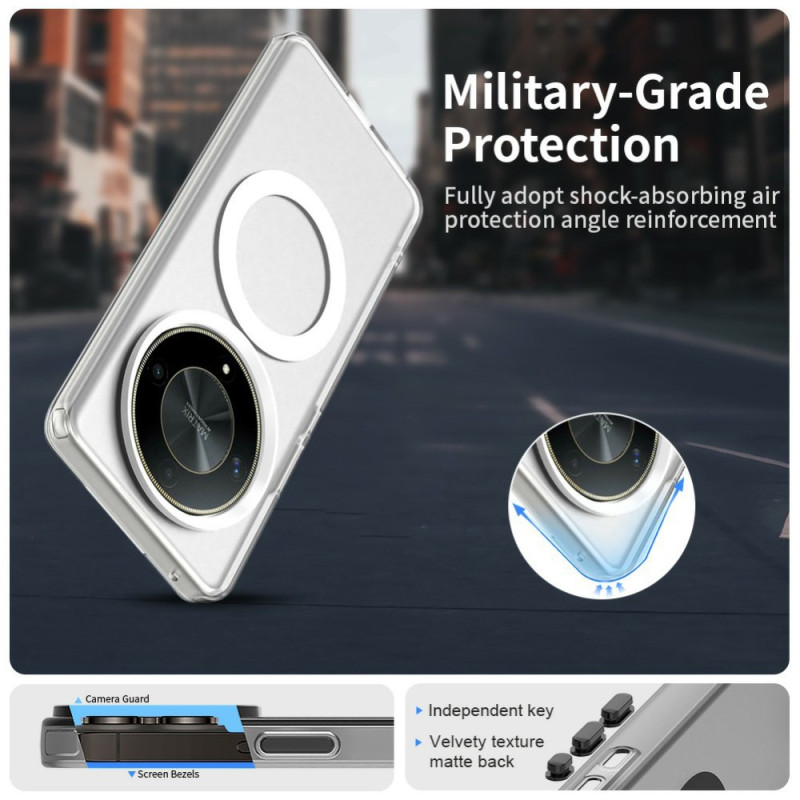 Funda protectora híbrida premium para Honor Magic 6 Lite / X9b. Diseño anti-caída con anillo magnético integrado, compatible con todos los accesorios magnéticos. Bordes elevados para proteger la pantalla y la cámara.
