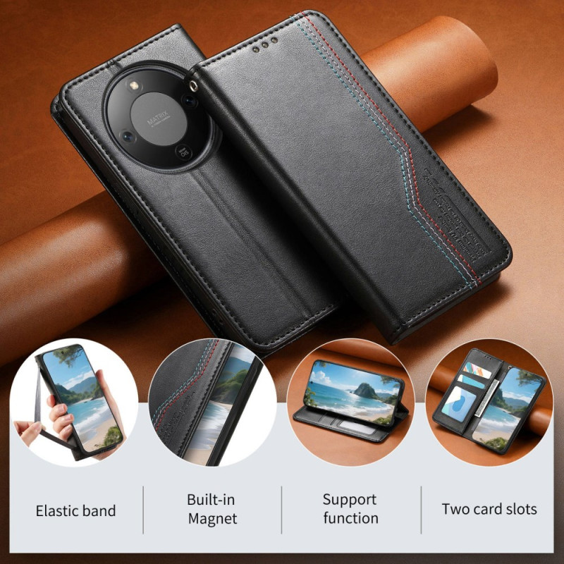 Descubre nuestra elegante funda cartera para el Honor Magic 8 Lite 5G. Con sus distintivas costuras tricolores, 2 ranuras para tarjetas, un portanotas y una práctica colgante para la muñeca. Función de soporte integrada...