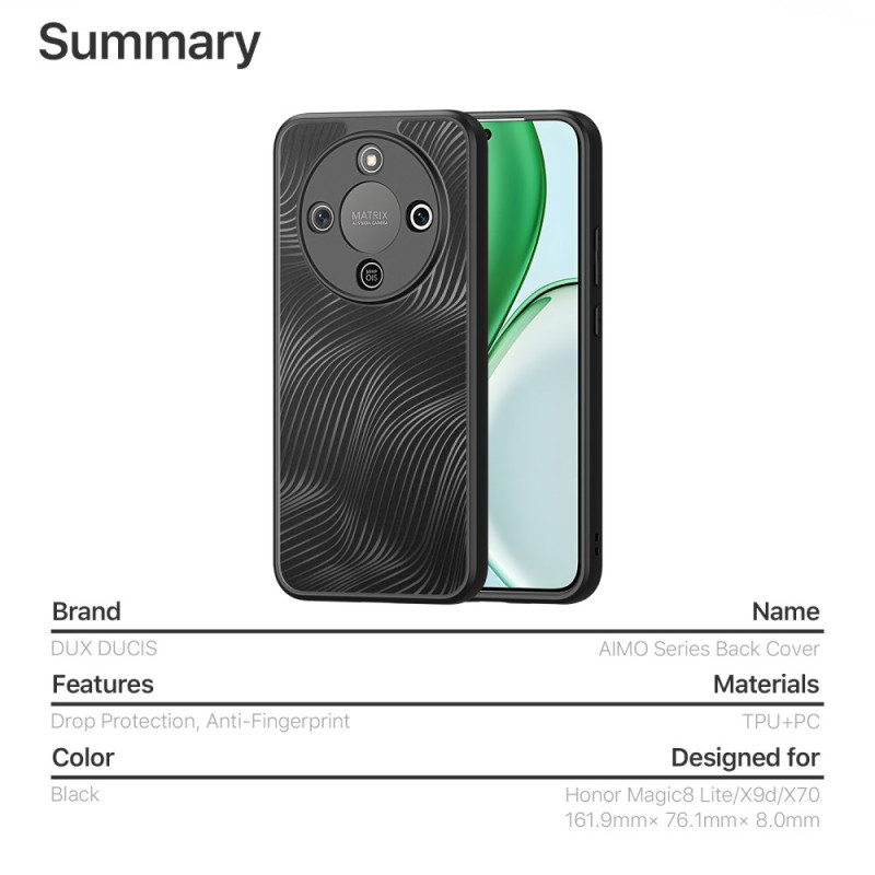 Protege tu Honor Magic 8 Lite 5G con estilo con la funda DUX DUCIS Serie Aimo. Con certificación REACH, esta funda combina un sofisticado diseño mate con una robusta protección contra caídas de hasta 1,2 m probada por SGS. Su ligero diseño bimaterial ofrece un agarre óptimo.