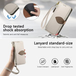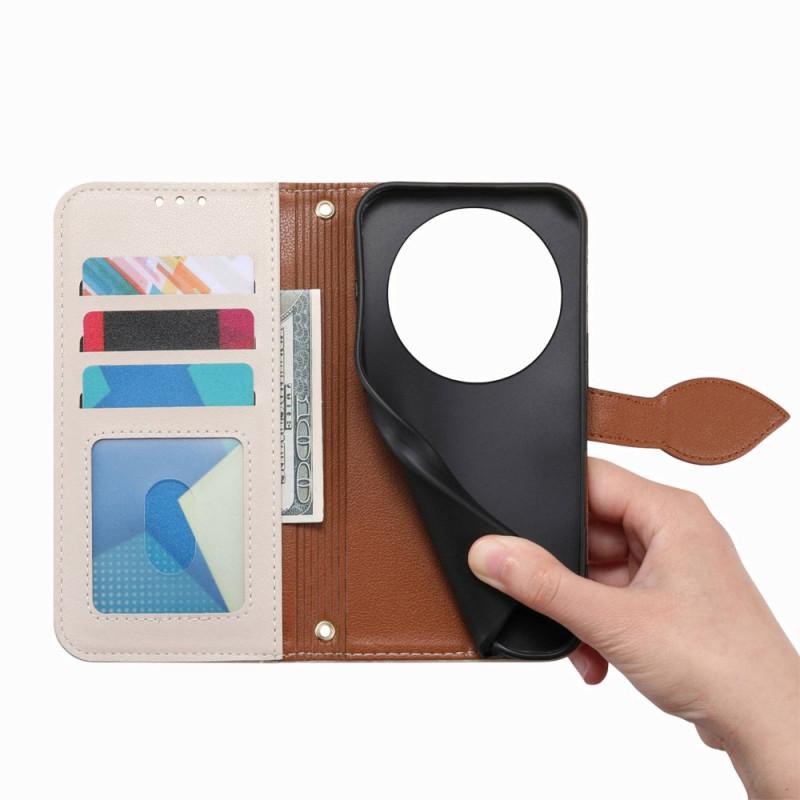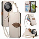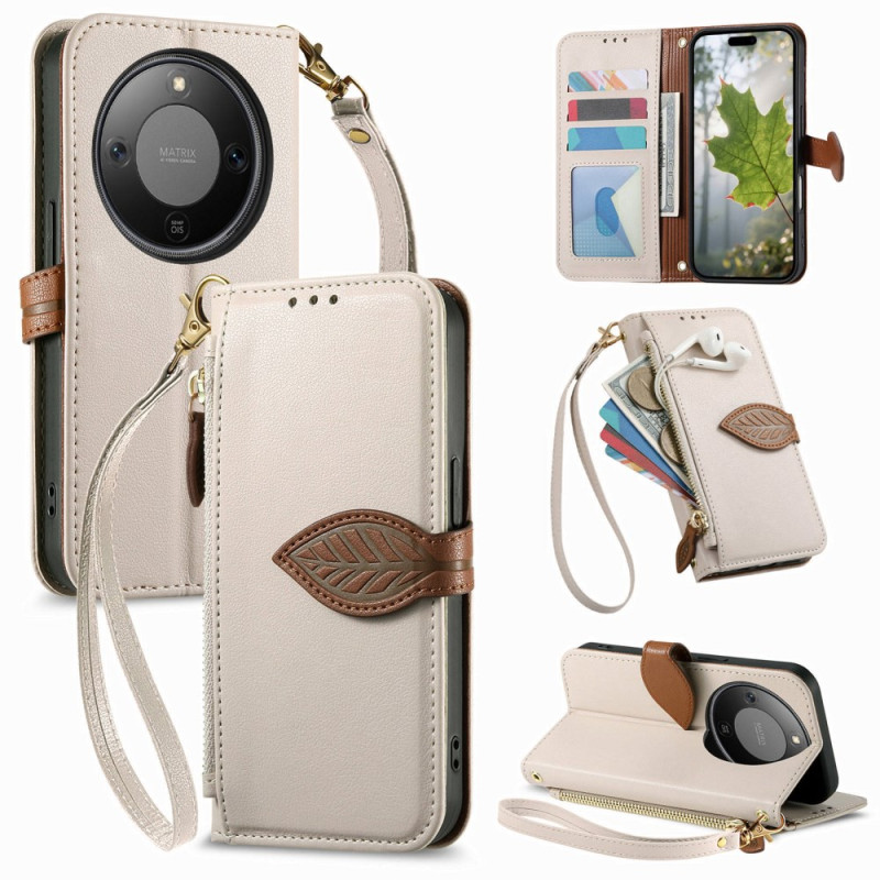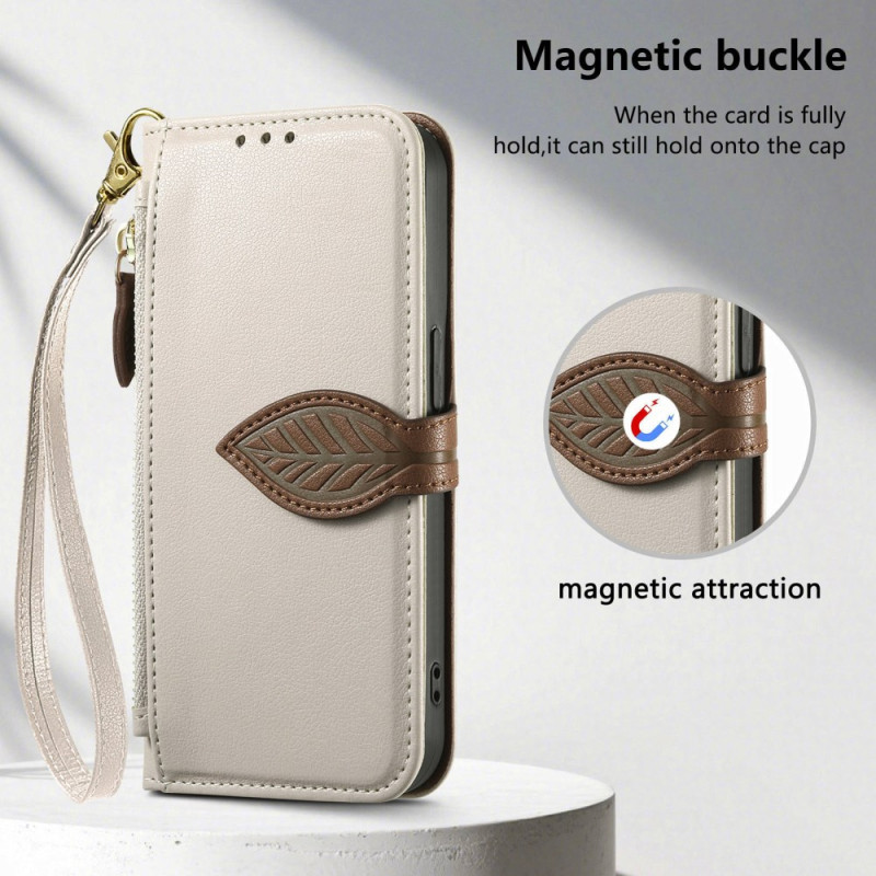 Elegante cartera con cierre magnético en forma de hoja. Dispone de 3 ranuras para tarjetas, 1 bolsillo para billetes y un bolsillo exterior con cremallera. Soporte integrado para tener las manos libres y colgante de mano extraíble para facilitar su transporte.