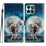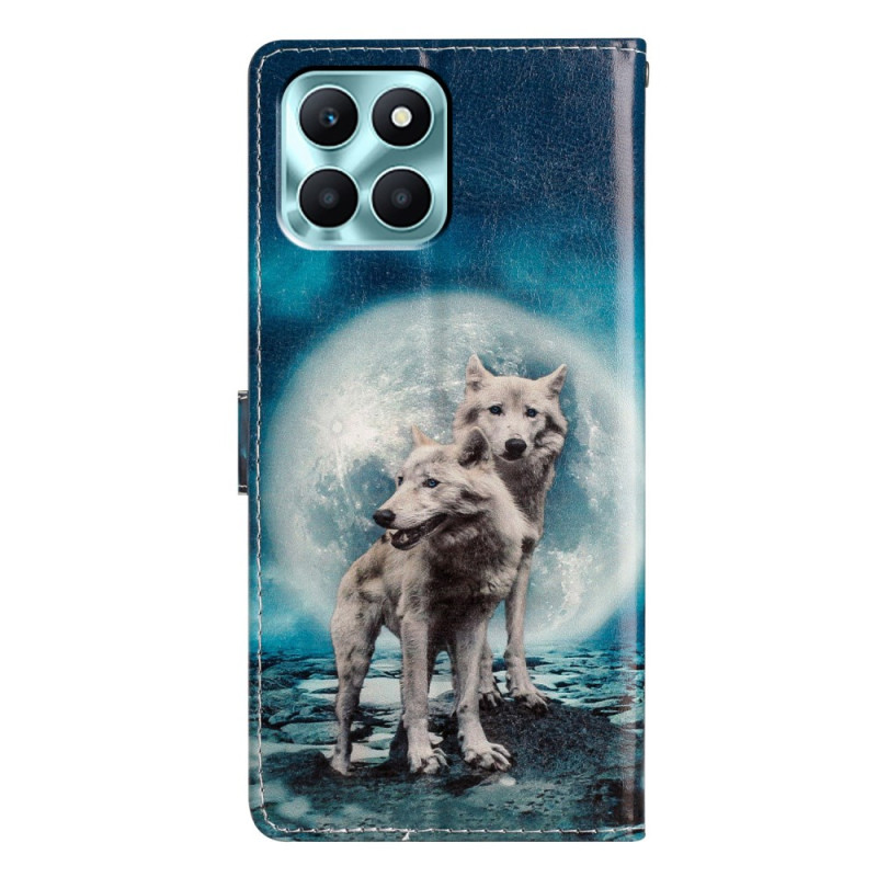 Elegante funda cartera para Honor X6c 4G con bonito diseño de dos lobos. Diseño práctico con 3 ranuras para tarjetas, bolsillo para dinero, función de soporte y colgante de mano. Cierre magnético seguro y protección total.