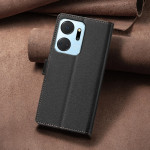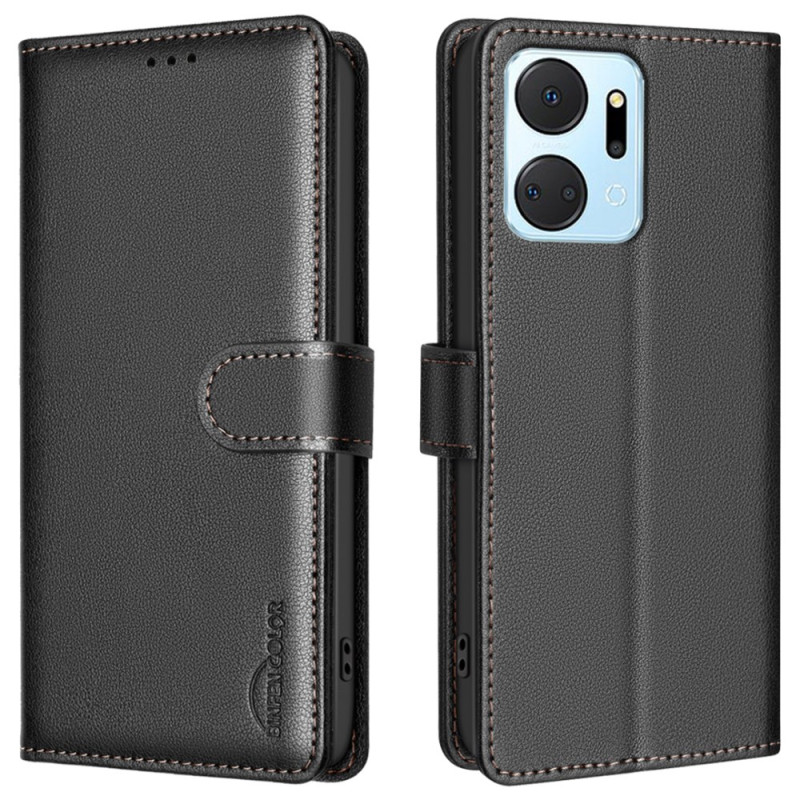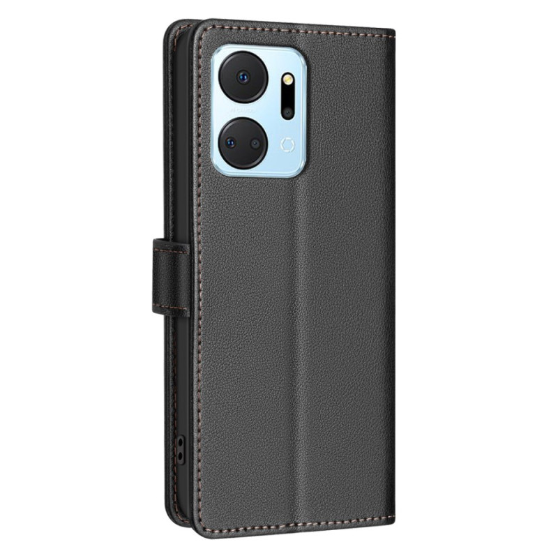 Funda premium de piel PU con textura de lichi para Honor X7a 4G. Con 3 ranuras para tarjetas, 1 bolsillo plateado y tecnología anti-RFID. Cierre magnético seguro y función de soporte manos libres para una comodidad óptima en el día a día.