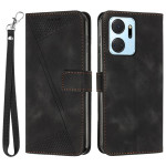 Elegante funda cartera de cuero PU y TPU para Honor X7a 4G. Diseño moderno con patrón triangular, función de soporte integrada, 3 ranuras para tarjetas y cierre magnético seguro. Protección completa contra los golpes cotidianos.