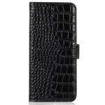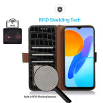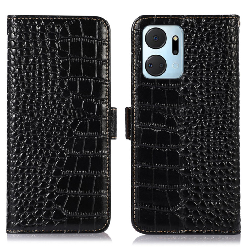 Elegante funda cartera de piel auténtica con textura de cocodrilo para Honor X7a 4G. Cuenta con 3 ranuras para tarjetas, 1 bolsillo para efectivo y tecnología de bloqueo RFID. Soporte ajustable integrado para una visualización cómoda.