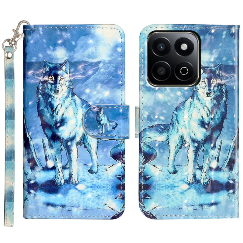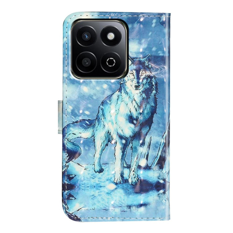 Elegante estuche billetero con motivo de lobo de las nieves impreso en 3D. Diseño funcional con tarjetero, soporte para vídeo ajustable y cierre magnético seguro. Protección completa para tu smartphone Honor en piel de PU de primera calidad.