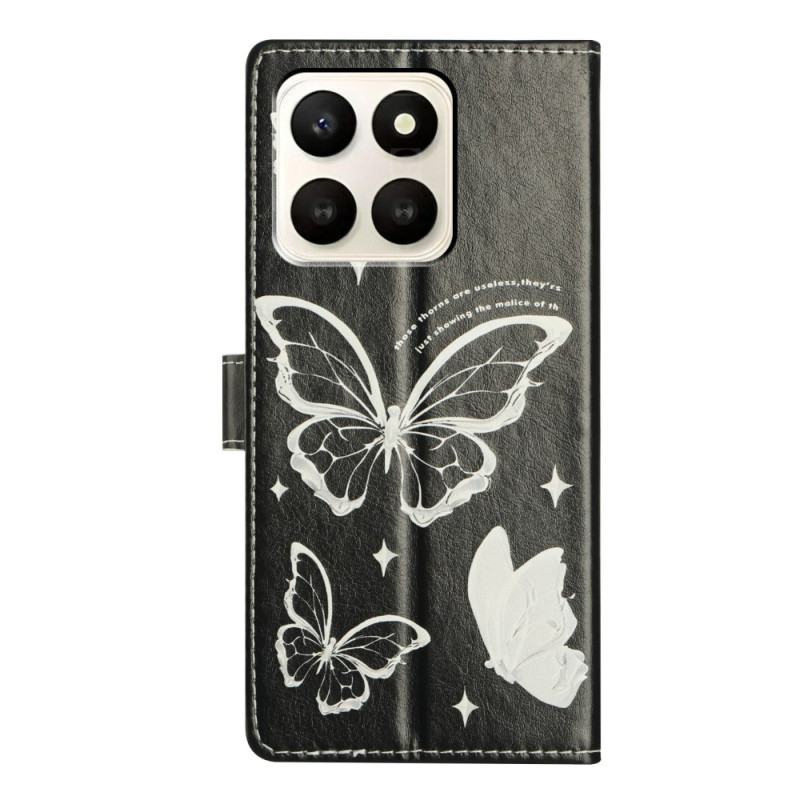 Elegante funda cartera con solapa para Honor X7d 5G con sofisticado estampado de mariposas. Incluye 2 ranuras para tarjetas, 1 bolsillo para fotos y un compartimento para efectivo. Función de soporte integrada para ver con las manos libres. Cierre magnético seguro y colgante de mano desmontable incluidos.