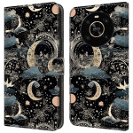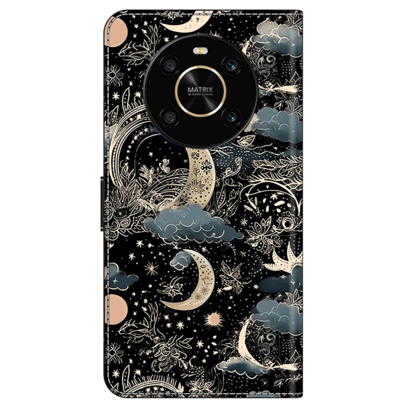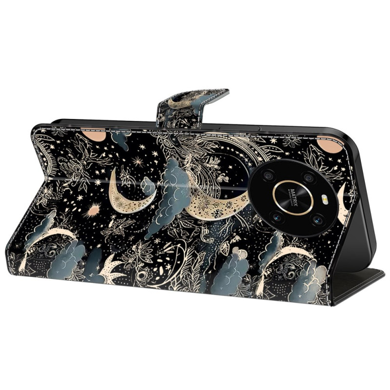 Elegante funda para Honor X9 5G que combina estilo y funcionalidad. Diseño refinado con motivo lunar, monedero integrado con 2 ranuras para tarjetas y 1 bolsillo para billetes. Soporte ajustable para una visualización manos libres. Protección completa antichoque y antiarañazos.