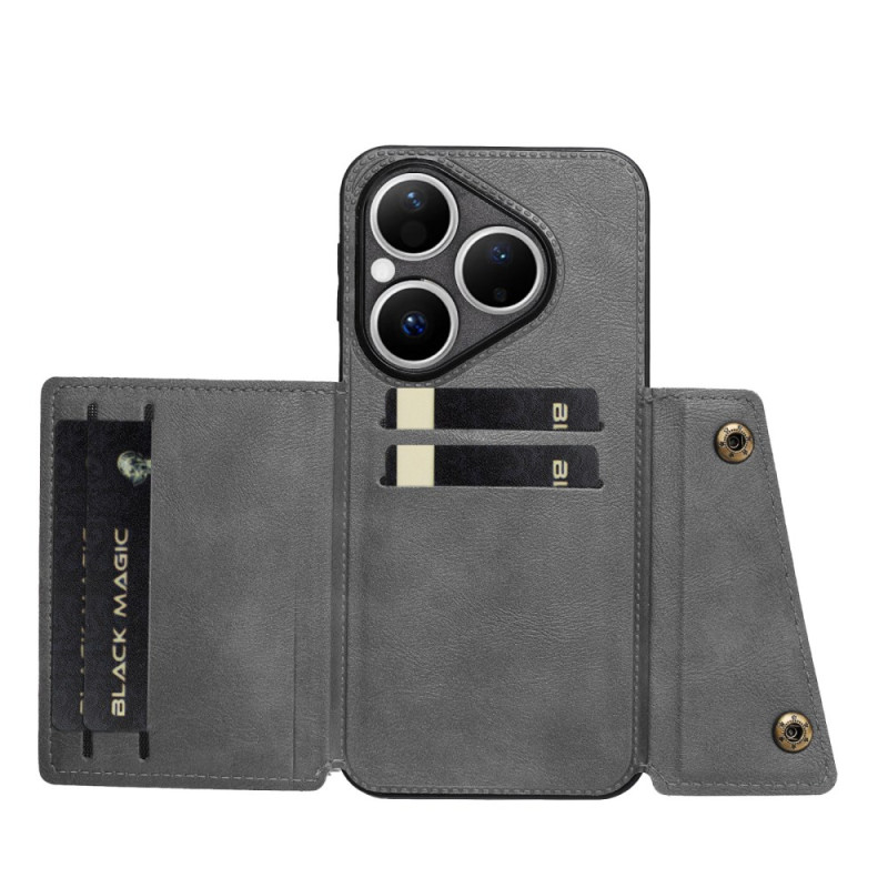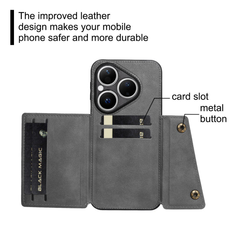 Funda multifuncional para Huawei Pura 80 que combina estilo y practicidad. Cuenta con tarjeteros integrados, un soporte ajustable para tener las manos libres y un cierre seguro de doble broche.