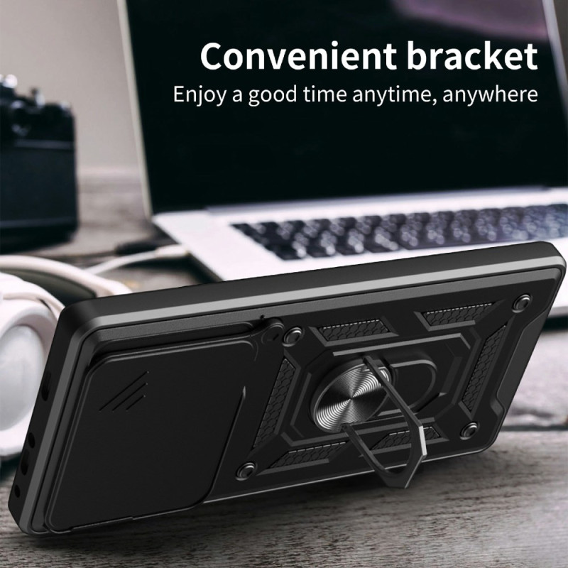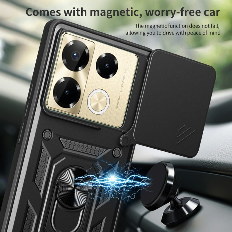 Protege tu Infinix Note 40 Pro con esta funda de primera calidad con tapa deslizante para el objetivo, soporte giratorio multiángulo y resistencia a impactos de grado militar. Compatible con soportes magnéticos para coche.