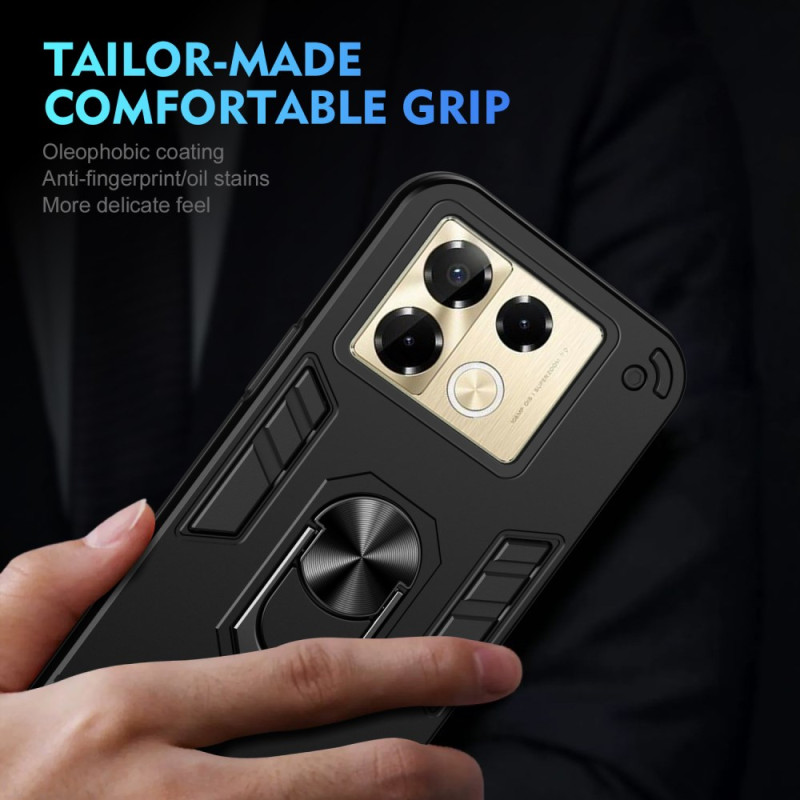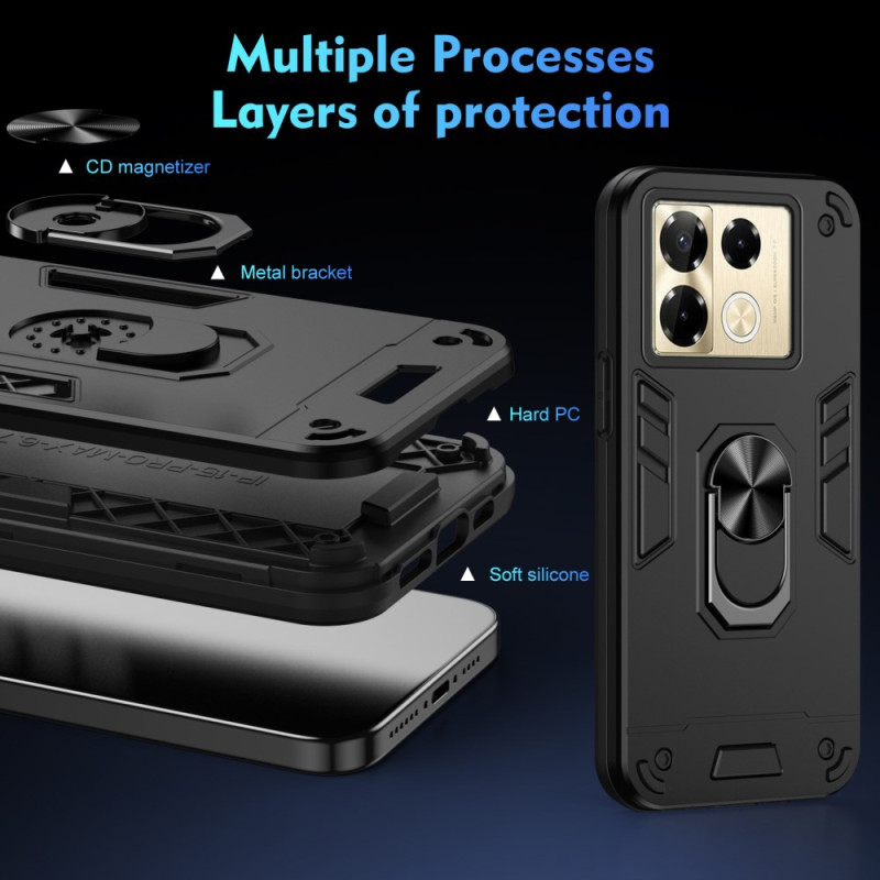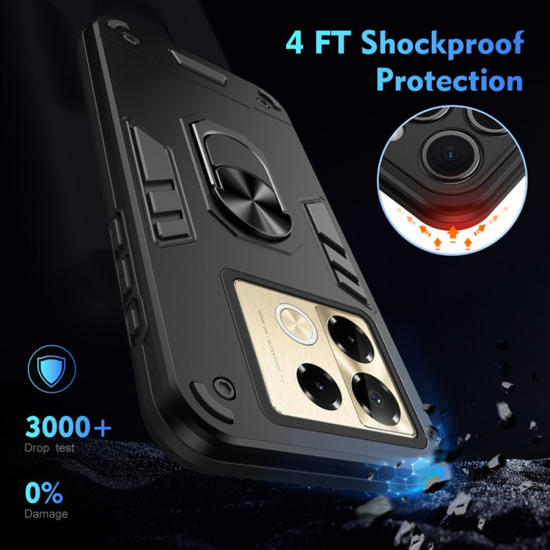 Protege tu Infinix Note 40 Pro 4G con esta resistente funda con soporte giratorio ajustable y compatible con soportes magnéticos para coche. Diseñada con bordes elevados para una protección óptima de la pantalla y la cámara.
