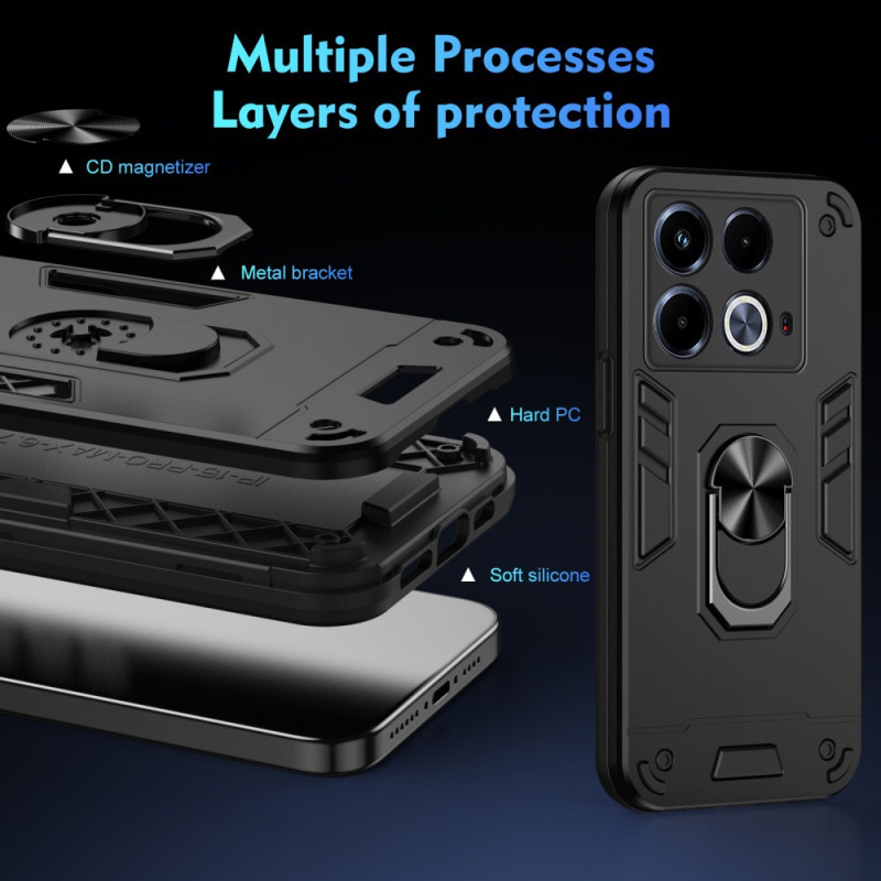 Proteja su Infinix Note 40 con esta resistente funda con soporte giratorio ajustable y compatibilidad con soporte para coche. Construcción duradera de PC y TPU, bordes elevados para proteger la pantalla y la cámara, recortes precisos.